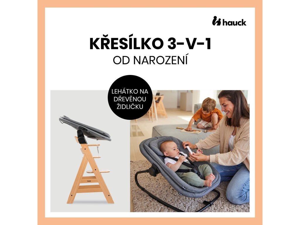 Chcete mít své děťátko neustále u sebe? Křesílko BOUNCER 3v1 je dodáváno spolu s adaptérem, který jej umožňuje nasadit na konstrukci vaší dřevěné židličky hauck Alpha+ nebo Beta+. Díky tomu můžete svou židličku používat již od narození a vaše děťátko může „sedět“ s vámi u stolu.