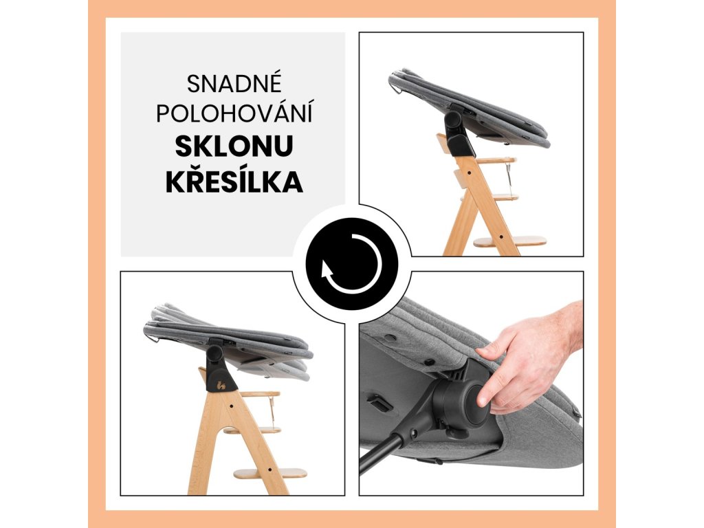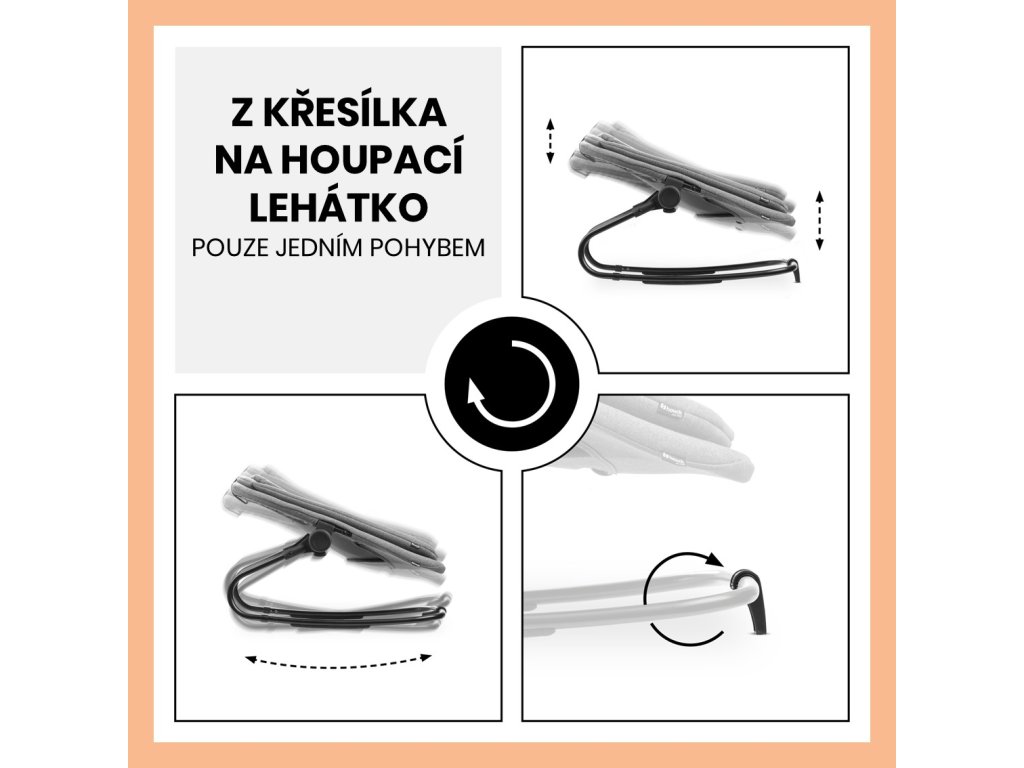 Z křesílka na houpací lehátko jedním pohybem - Jednoduchým pohybem změníte pohyb křesílka z „hopsacího“ na houpací. Nebo jej jednoduše nasadíte na dřevěnou židličku.
