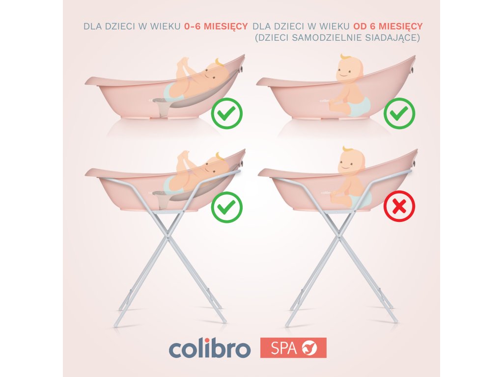 Stojan je navržen speciálně pro vaničku Colibro Spa, což zajišťuje její stabilitu a bezpečnost. Výška 58 cm je optimální pro rodiče, kteří tak mají plnou kontrolu nad koupáním dítěte. Je důležité poznamenat, že stojan je určen pouze pro děti do 6 měsíců, které ještě nesedí samostatně. Jakmile dítě začne sedět nebo se pokouší vylézt, doporučuje se vaničku umístit na zem.