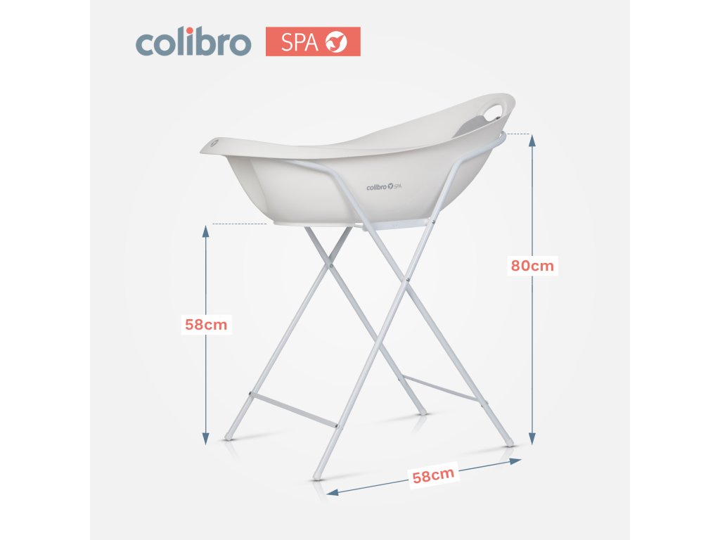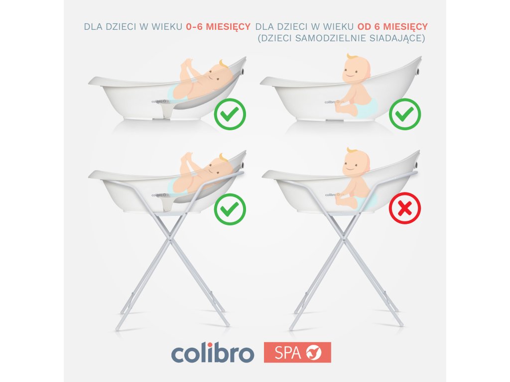 Stojan je navržen speciálně pro vaničku Colibro Spa, což zajišťuje její stabilitu a bezpečnost. Výška 58 cm je optimální pro rodiče, kteří tak mají plnou kontrolu nad koupáním dítěte. Je důležité poznamenat, že stojan je určen pouze pro děti do 6 měsíců, které ještě nesedí samostatně. Jakmile dítě začne sedět nebo se pokouší vylézt, doporučuje se vaničku umístit na zem.