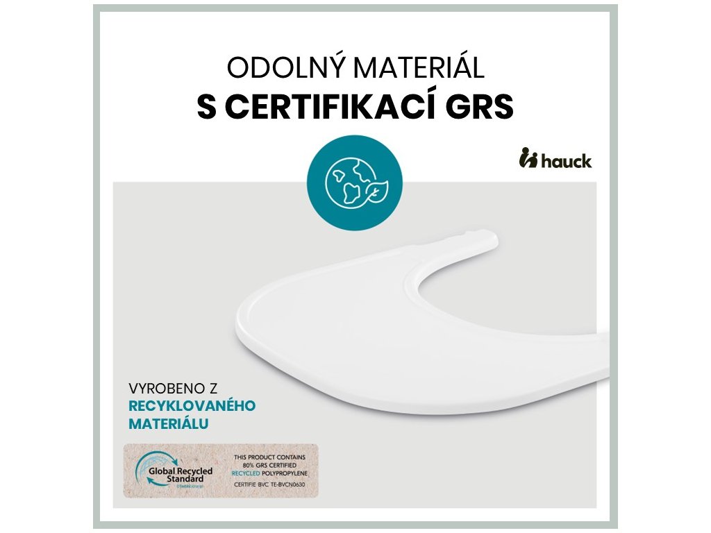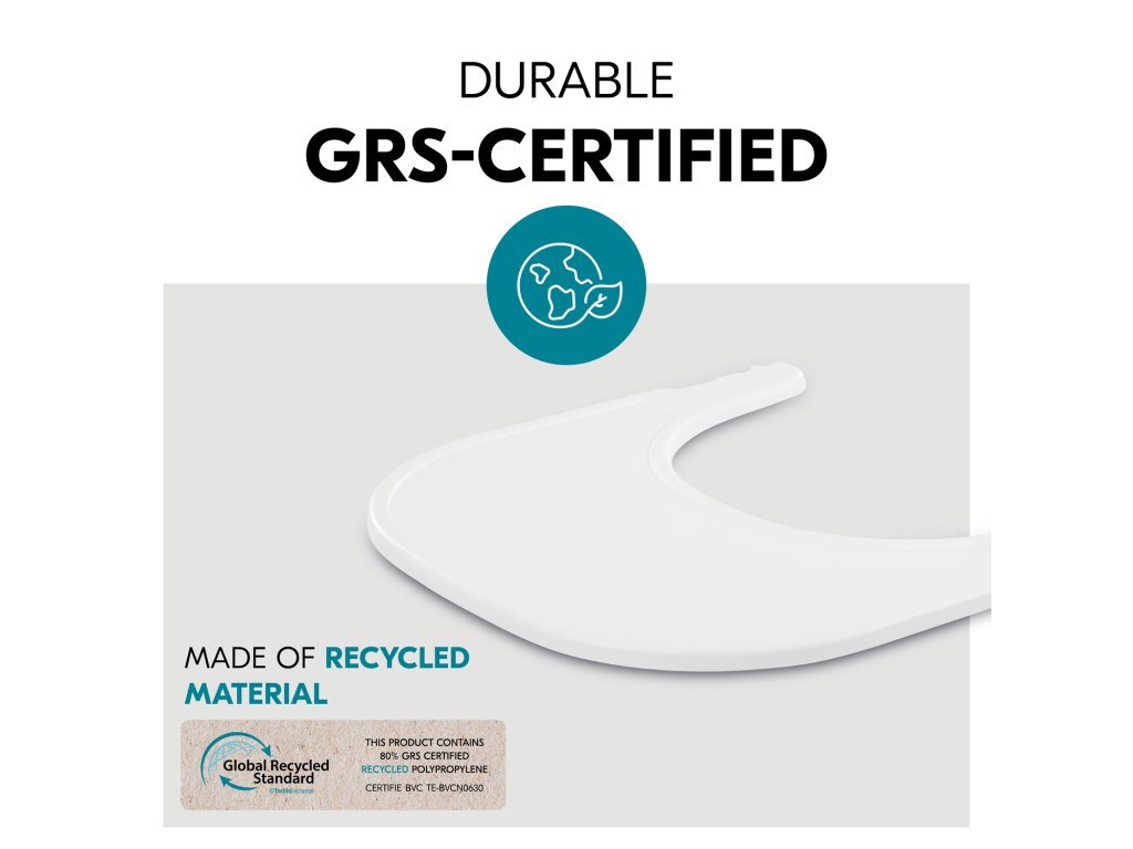 UDRŽITELNÝ MATERIÁL S CERTIFIKACÍ „GRS“ // Pultík pro dětskou židličku je vyroben z materiálu s certifikací „Global Recycled Standard“ (GRS), což je norma která řeší sledování původu surovin, environmentální zásady, sociální požadavky, chemický obsah a označování produktů.