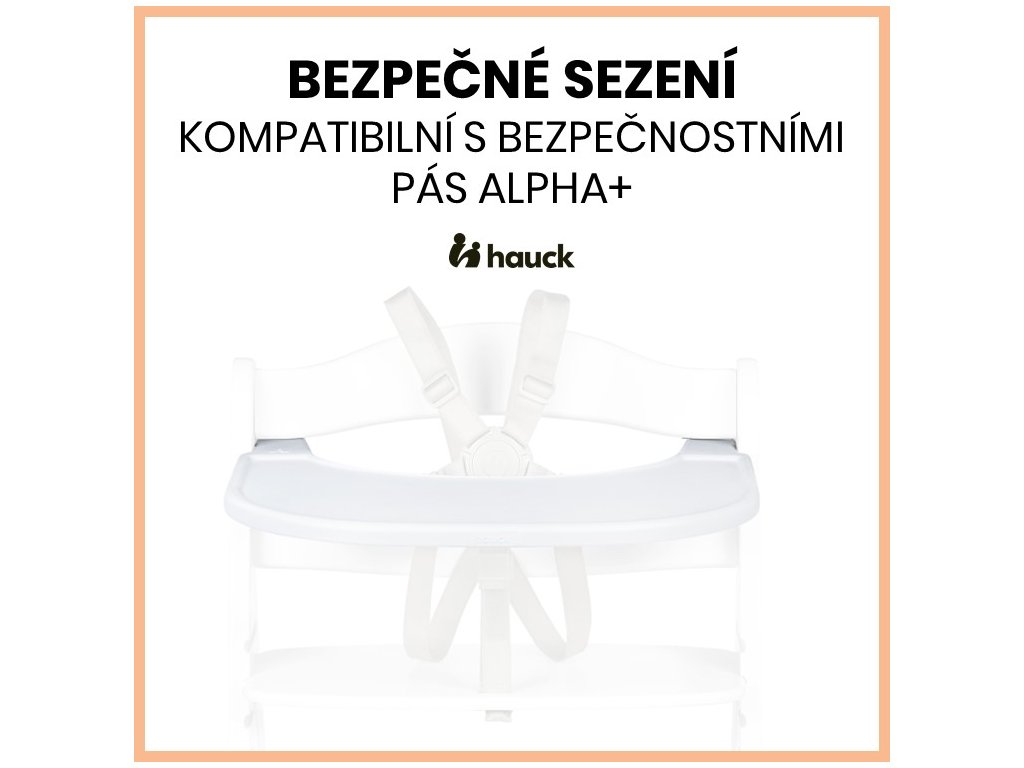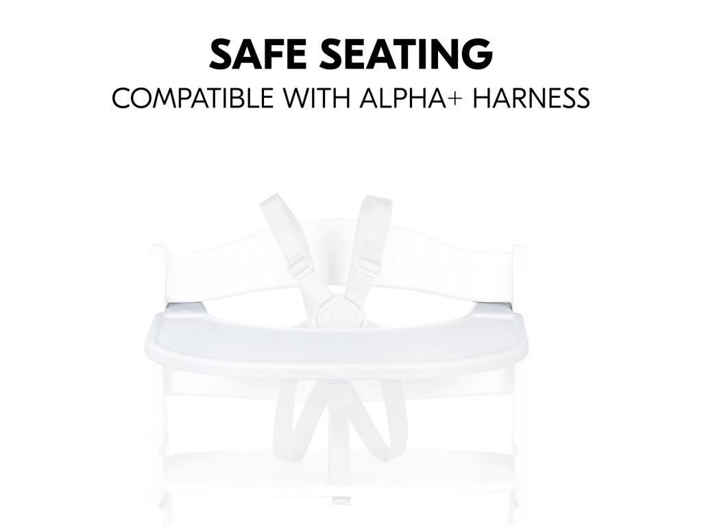 BEZPEČNÉ SEZENÍ S PULTÍKEM A BEZPEČNOSTNÍMI PÁSY // Díky kompatibilitě pultíku s pětibodovými bezpečnostními pásy a bezpečnostním popruhem Alpha je vaše dítě dobře zabezpečeno a může bezpečně kopat nožičkama i proti stolu.