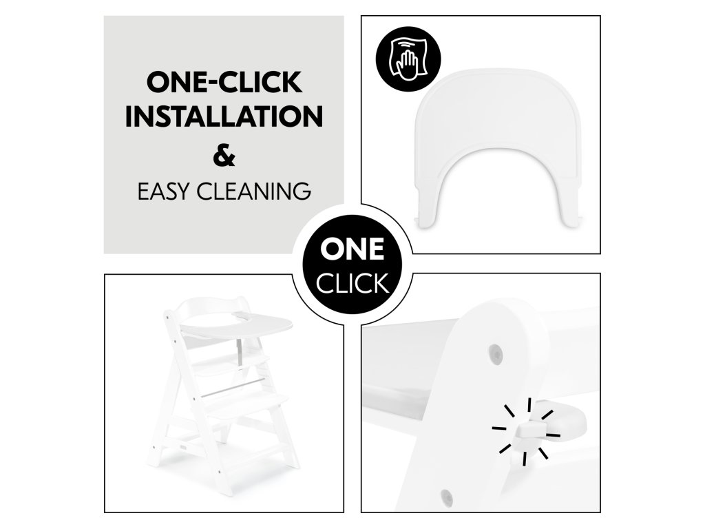 INSTALACE NA ŽIDLIČKU JEDINÝM KLIKNUTÍM A SNADNÉ ČIŠTĚNÍ // Pultík lze snadno nacvaknout na dětskou židličku Alpha+. Hladký povrch pultíku se velmi snadno čistí hadříkem a běžnými čisticími prostředky.