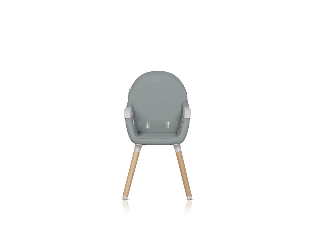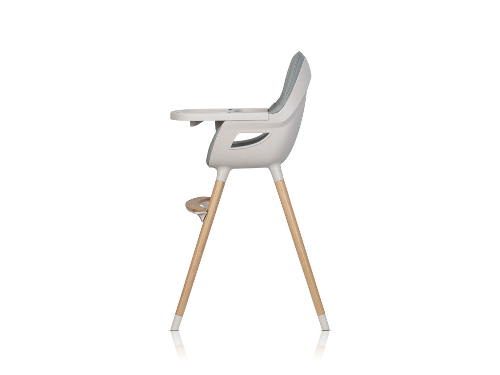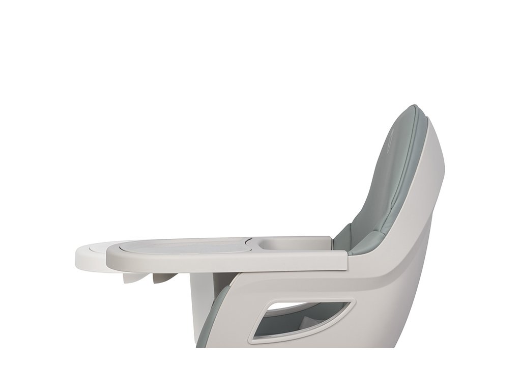 Bezpečnost především: Židle je vybavena 5-bodovými bezpečnostními pásy a tácem s dodatečným krokovým zabezpečením. Stabilitu zajišťuje jednotná konstrukce sedáku a protiskluzové nožičky.