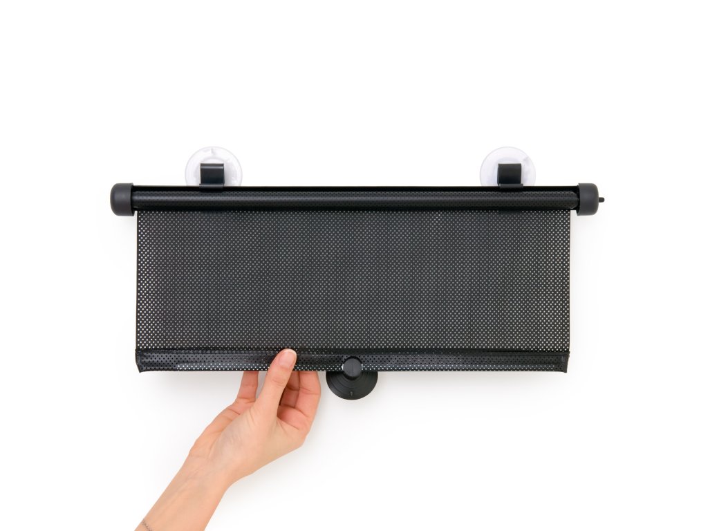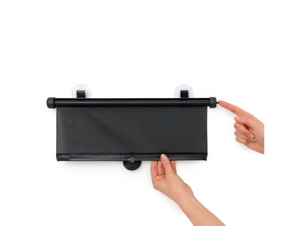 Jednoduché připevnění // Roletu lze připevnit buď pomocí dvou věšáčků s háčkem přímo na okno vozidla, nebo pomocí extra silné přísavky na okenní tabuli. Tato sluneční ochrana se vyroluje zmáčknutím tlačítka po straně vodící lišty. 2 ks v balení.