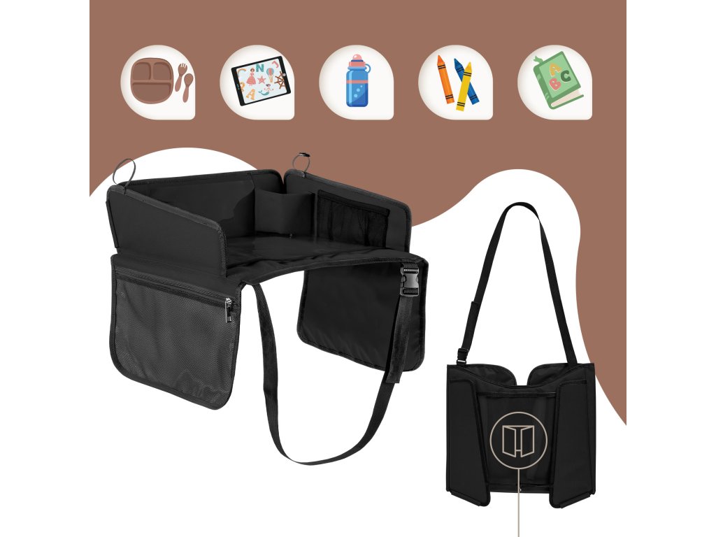 Stolek je vybaven průhlednou kapsou na tablet, do které se vejdou zařízení až do velikosti 11 palců, a umožňuje tak bezpečné a pohodlné sledování kreslených filmů během jízdy. Součástí je také držák na nápoje a praktické boční kapsy pro uložení školních potřeb, hraček, kapesníků nebo svačinek. Vysoké skládací boční stěny zabraňují vypadávání drobných předmětů a nastavitelné bezpečnostní popruhy zajišťují stabilitu stolku i na nerovných silnicích. Lehký, skládací a snadno přenosný – je to perfektní společník na cesty.