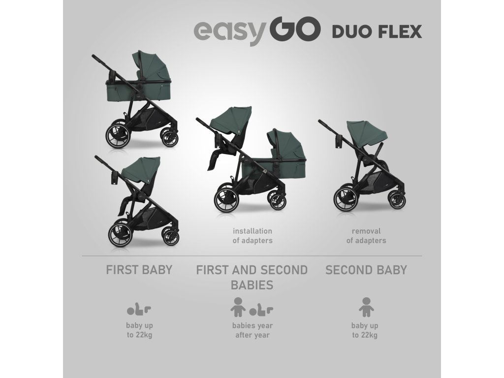 Sourozenecký kočárek EasyGo Duoflex Sage Green, 2 sportovní části, 1 hluboká vanička