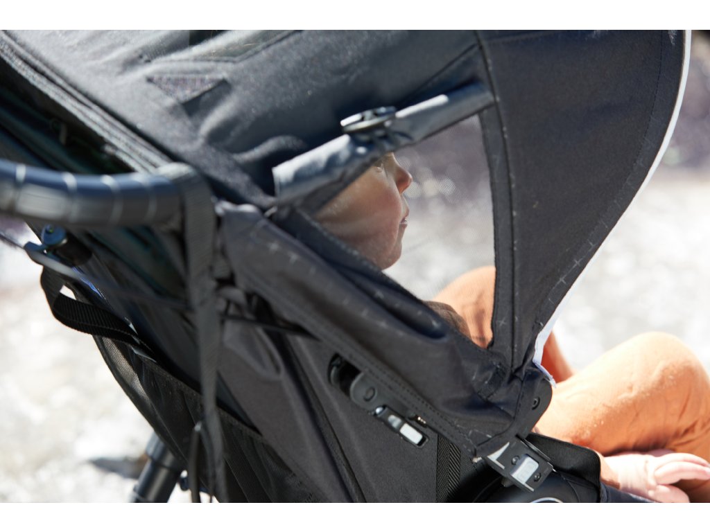 UV 50+ BOUDA S BOČNÍM VĚTRÁNÍM // Boudu s ochranou UV 50+ je možné nastavit do několika pozic. Má dvě okýnka "peek-a-boo" pro snadné pozorování vašeho drobečka. Boky s ventilací zajišťuji dostatečnou cirkulaci vzduchu, aby bylo vaše dítě v pohodlí.