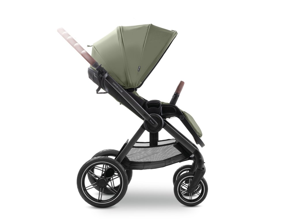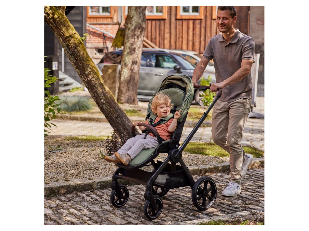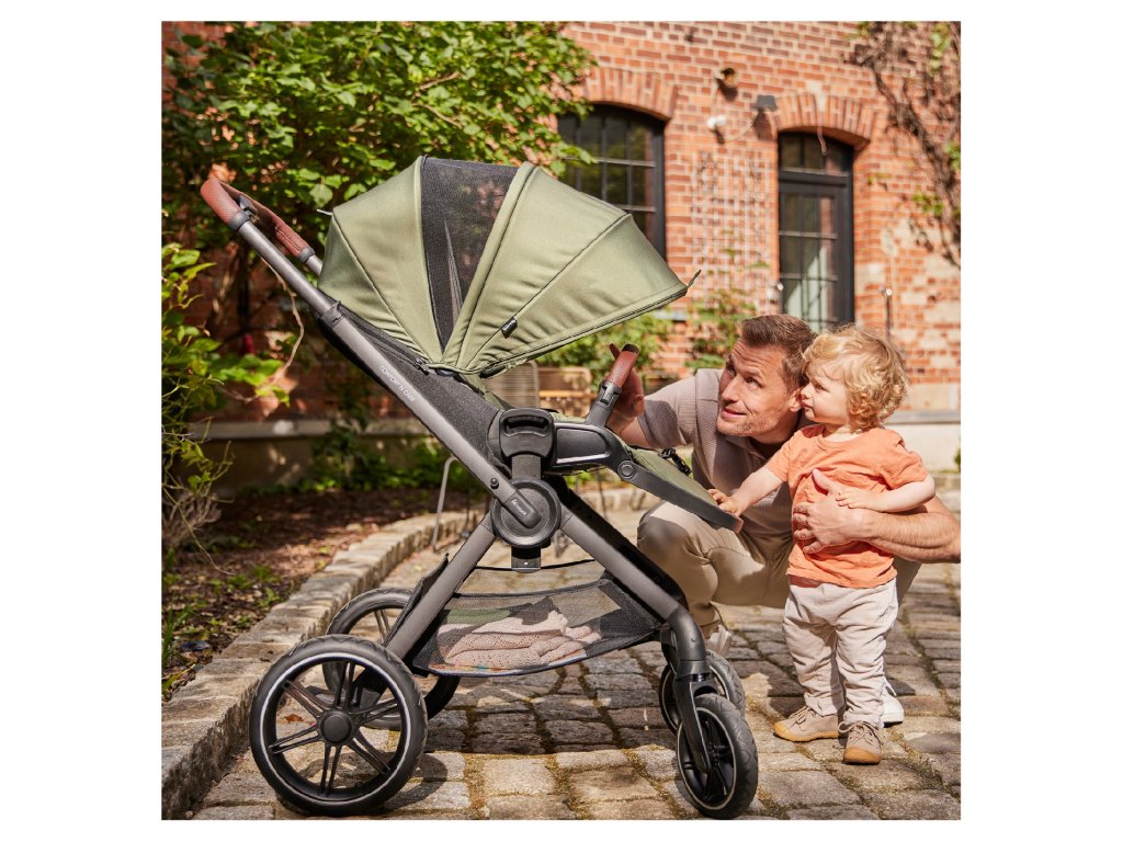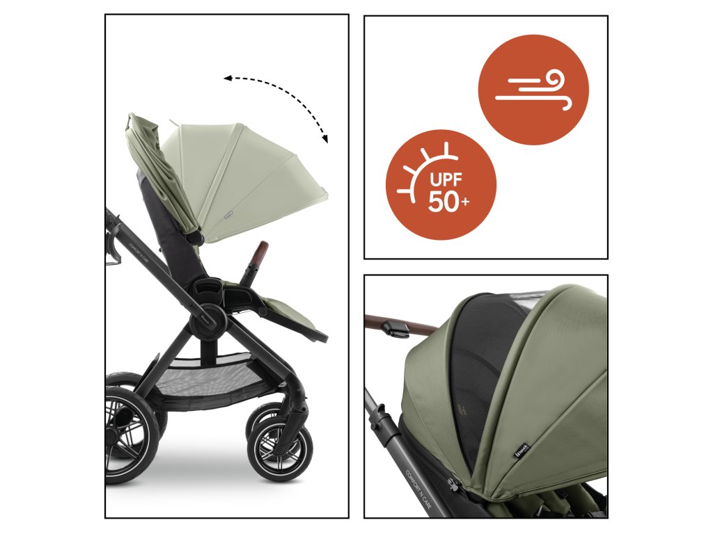 Bezpečné a pohodlné cestování // Gumová kola do každého terénu jsou připravena na každý výlet. Odpružení 4x4 jemně pohupuje vaše děťátko, XL sluneční stříška s prodloužením (s UV 50+) nabízí ochranu před každým počasím a XL panoramatická síťovaná okénka zajišťují čerstvý vzduch. Sedátko kočárku má výškově nastavitelné 5bodové bezpečnostní pásy, dobře polstrovanou, extra vysokou opěrku zad a nánožník.