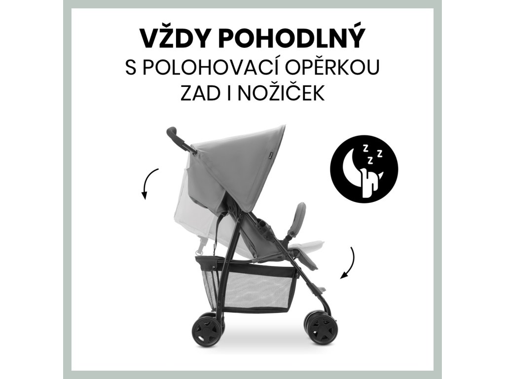 POHODLNÝ V KAŽDÉ SITUACI // Díky polohovací opěrce zad i nožiček se bude vaše maličké cítit pohodlně ať v sedě či v leže. Opěrku lze snadno polohovat jednou rukou. Prostorná stříška chrání vaše děťátko před sluncem a větrem.