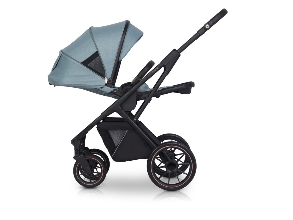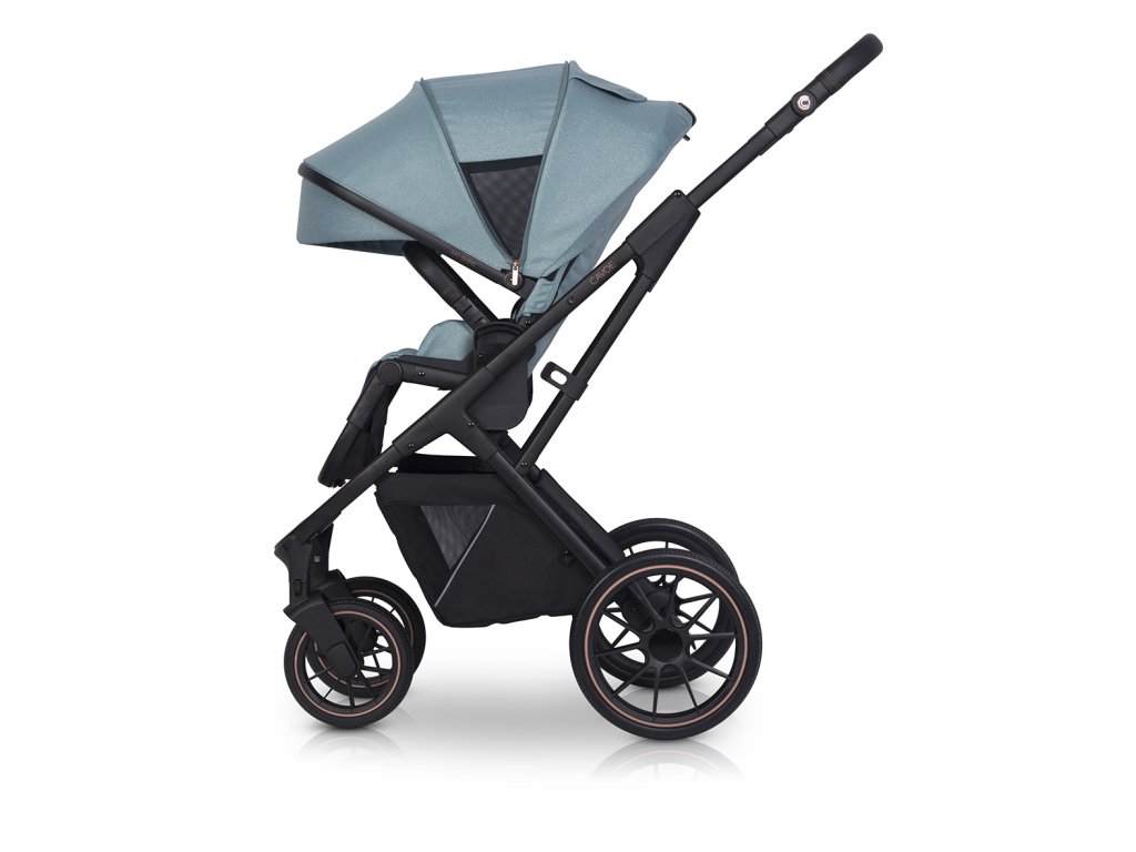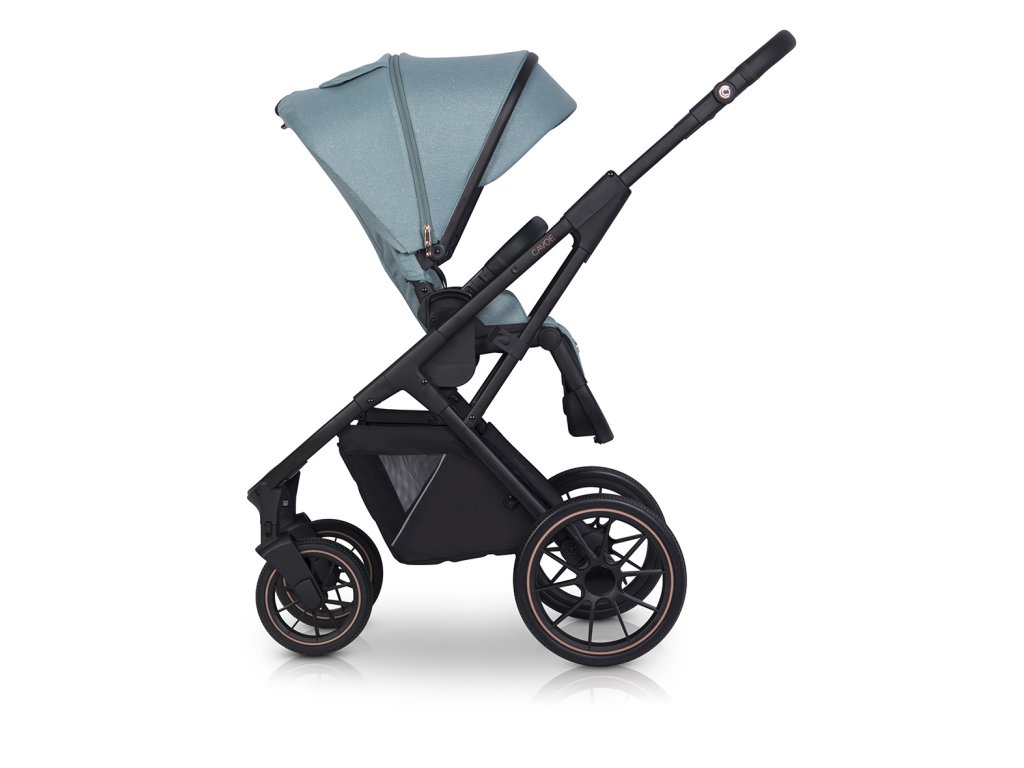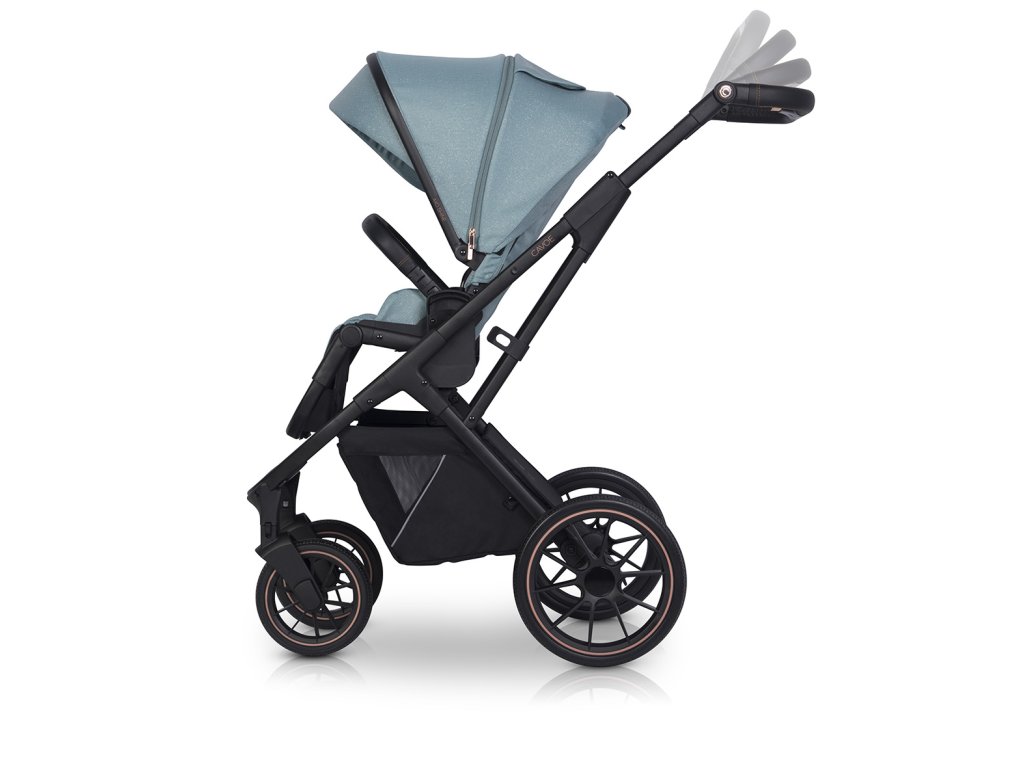 - Nastavitelná výška rukojeti: Umožňuje pohodlné vedení kočárku pro rodiče různé výšky, s elegantními kovovými prvky v barvě Rose Gold.