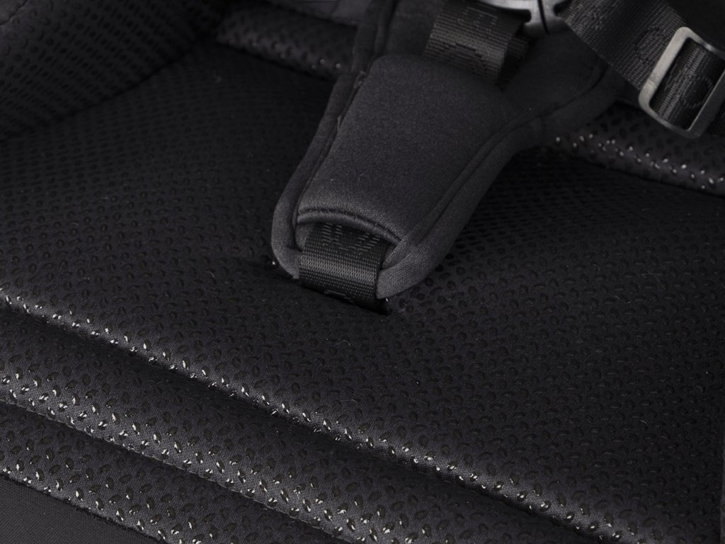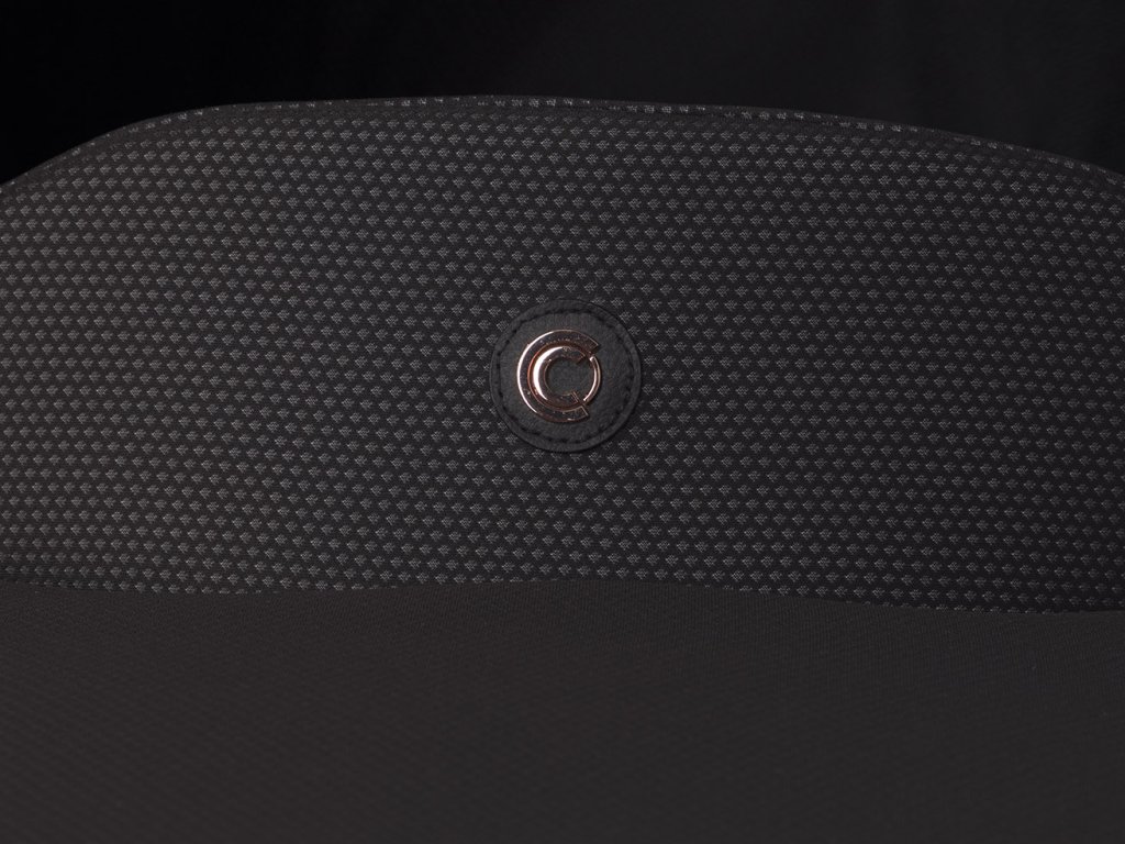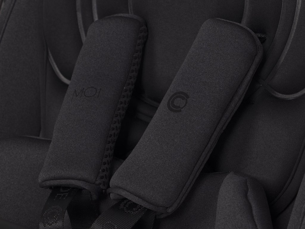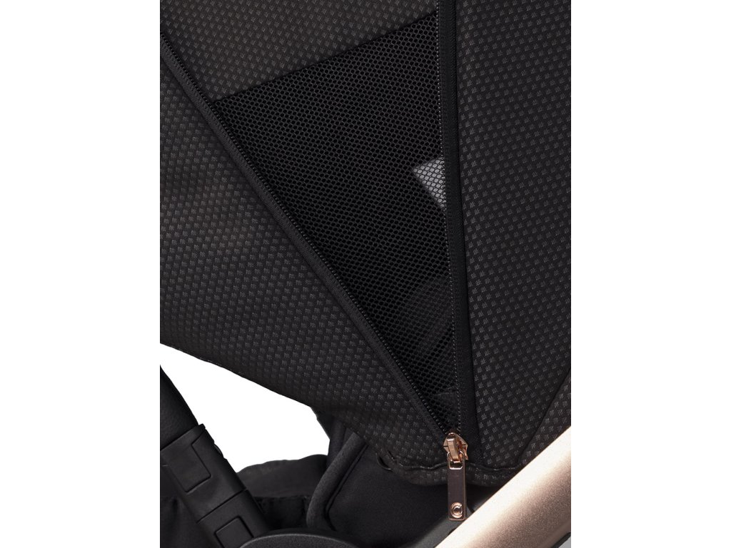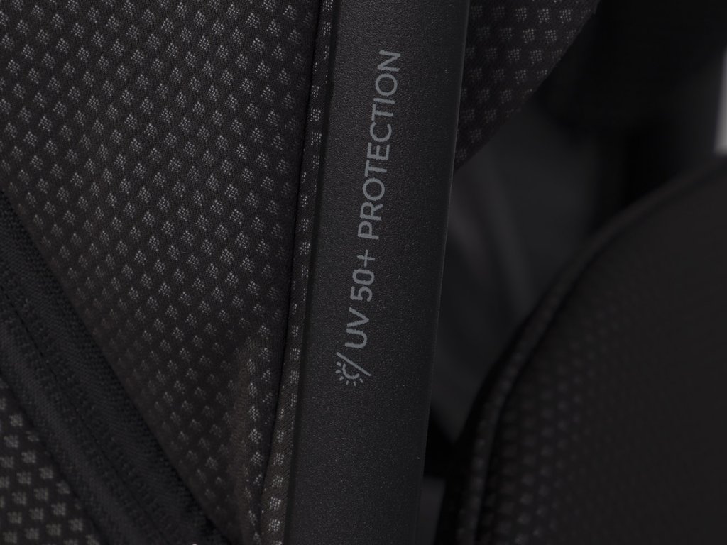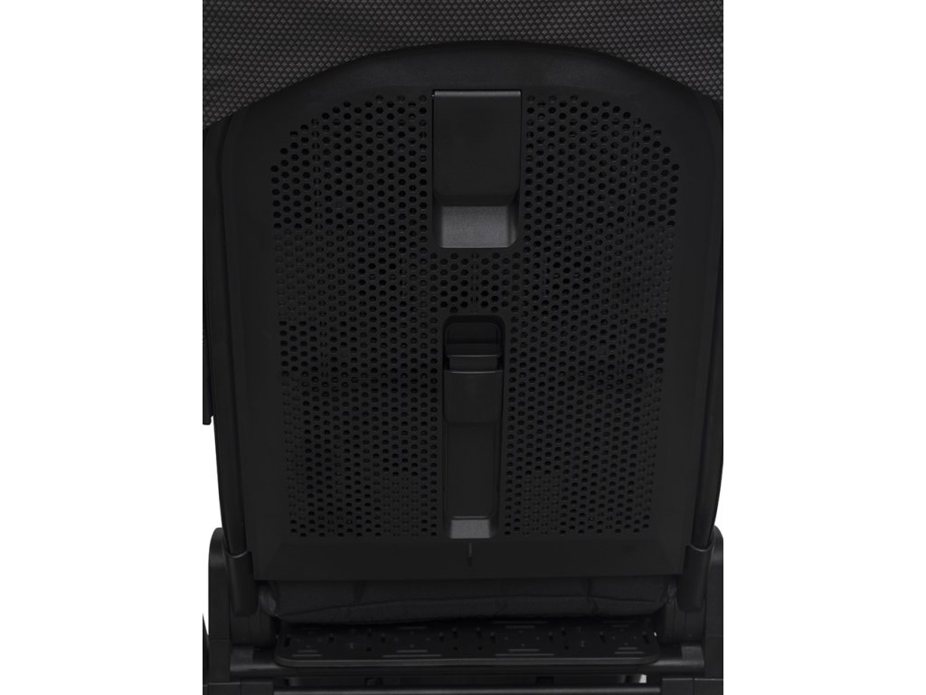 - Ventilace zádové opěrky: Kromě klasické ventilace ve stříšce má sedák Moi+ unikátní systém větrání přímo ve skořepině zádové opěrky, což zaručuje tepelný komfort i během nejteplejších dnů.