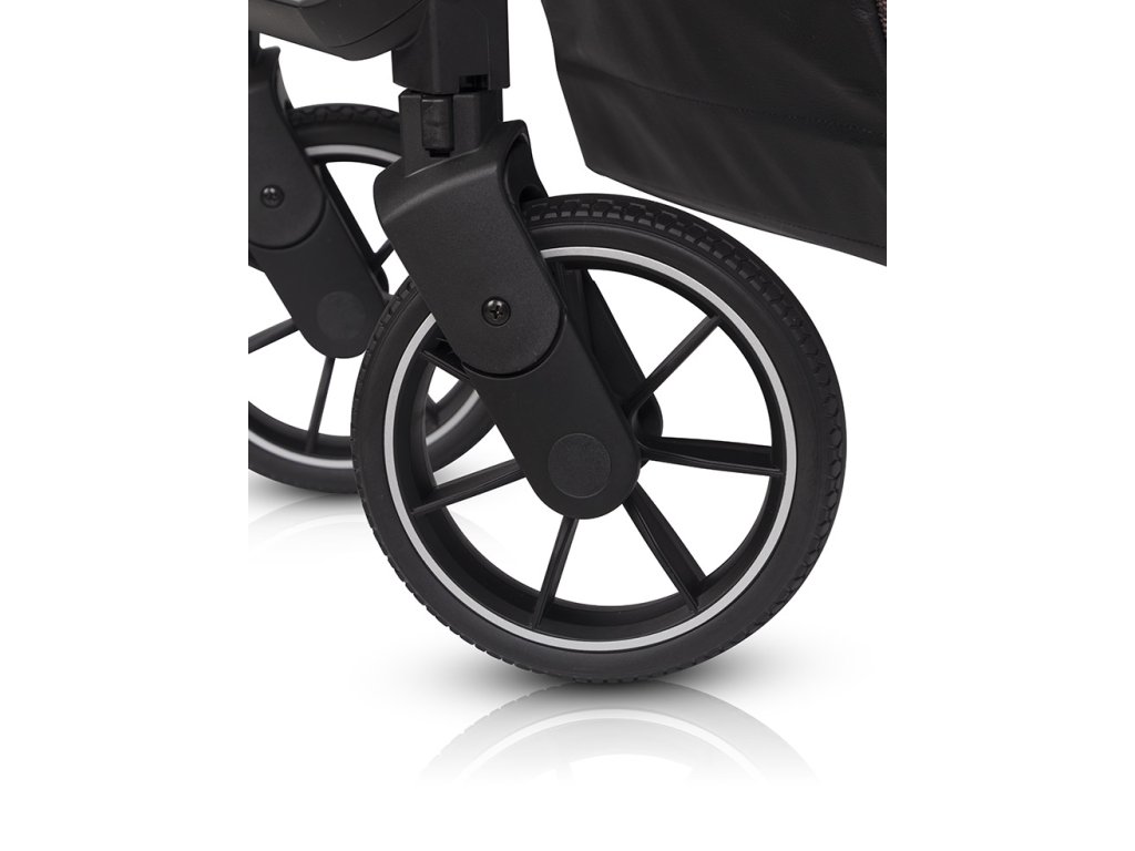 Teleskopická rukojeť s elegantním potahem z ekokůže umožňuje plynulé nastavení výšky, takže si kočárek dokonale přizpůsobíte své postavě, ať už jste vysoký nebo nízký. Rukojeť se vysouvá daleko za linii zadních kol, což poskytuje dostatek prostoru pro nohy a zabraňuje zakopávání o konstrukci. Zároveň to usnadňuje nadzvedávání kočárku, například při vyjíždění na obrubník.