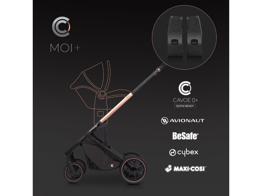 Cavoe Moi+ je k dispozici jako samostatný sportovní kočárek, v setu 2v1 s hlubokou vaničkou nebo jako kompletní cestovní systém 3v1 s autosedačkou CAVOE 0+ ISOFIX Ready. Díky univerzálním adaptérům (prodávají se samostatně) lze na konstrukci nasadit i autosedačky jiných známých světových značek.