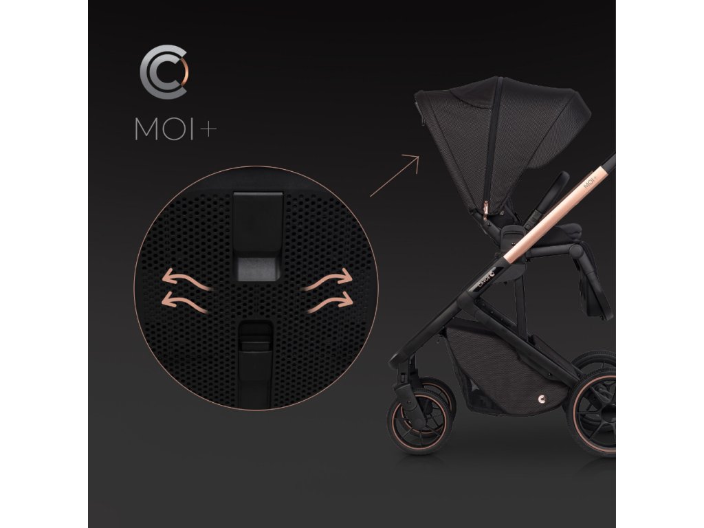 Inovativní 3-stupňová regulace stříšky: Toto je skutečná revoluce ve světě kočárků. Unikátní systém umožňuje zvednout celou sluneční stříšku až o 8 cm výše. Co to znamená v praxi? Získáte dodatečný prostor, který může znamenat až o rok delší používání kočárku. Už žádné starosti s tím, že dítě rychle vyroste a hlavou se bude dotýkat stříšky. Moi+ doslova „roste“ spolu s vaším dítětem, čímž vám šetří peníze a starosti s hledáním nového modelu.