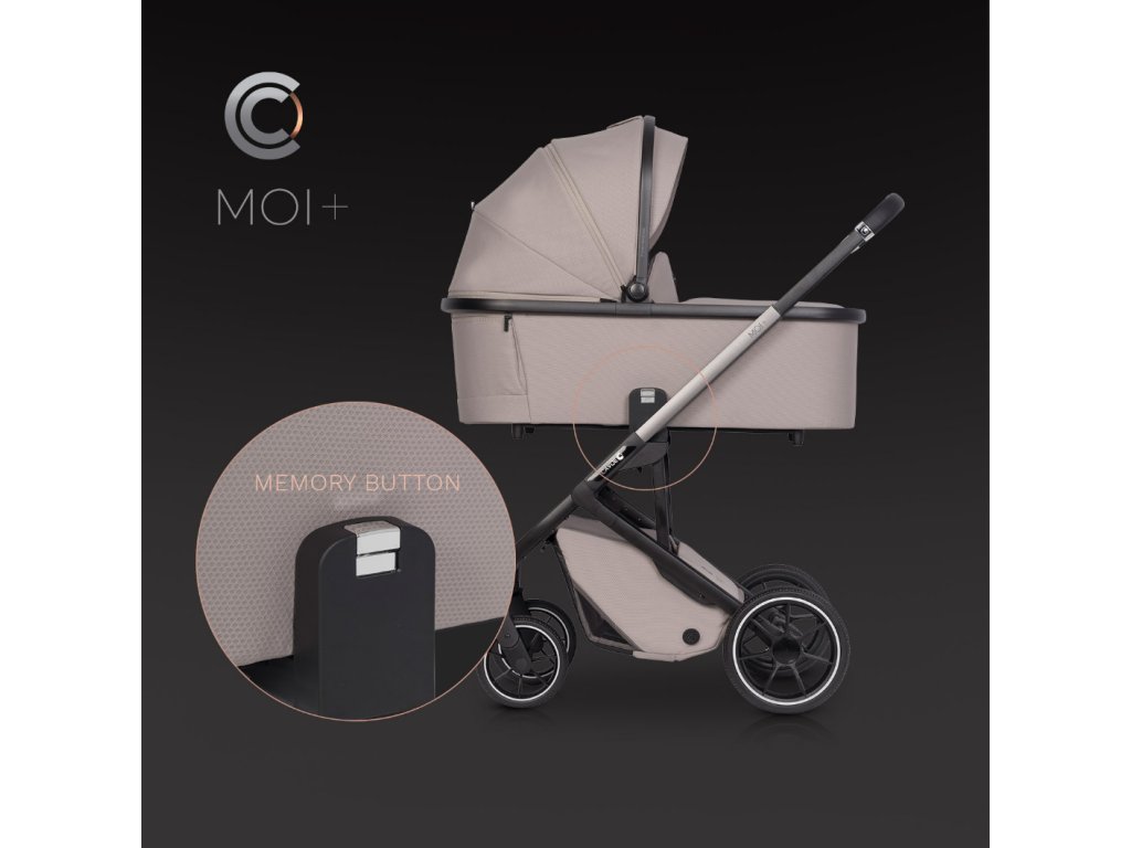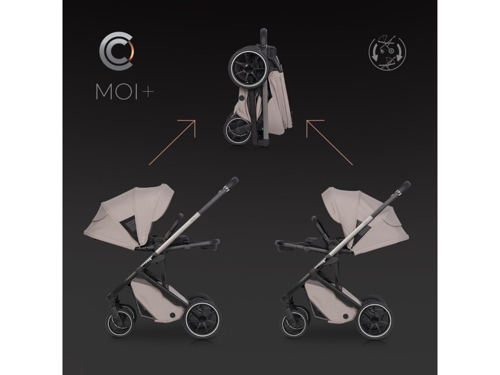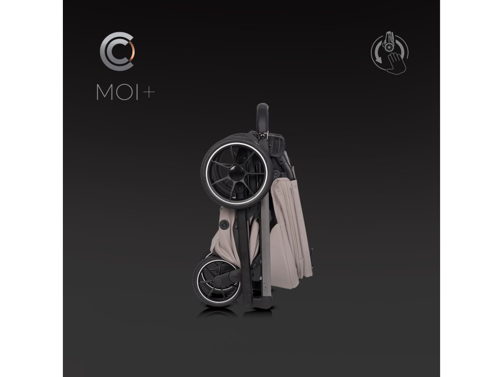 Po složení kočárek samostatně stojí na kolech. Tím se eliminuje riziko náhodného znečištění potahů nebo poškrábání konstrukce o zem. Složený Moi+ můžete také postavit vertikálně a táhnout za sebou jako kufr na kolečkách, což je ideální při cestování nebo pohybu na letištích a nádražích. Nízká hmotnost a kompaktní rozměry (pouze 40 x 52 x 69 cm se sedadlem) usnadňují jeho přenášení a skladování i v malém bytě či kufru auta.