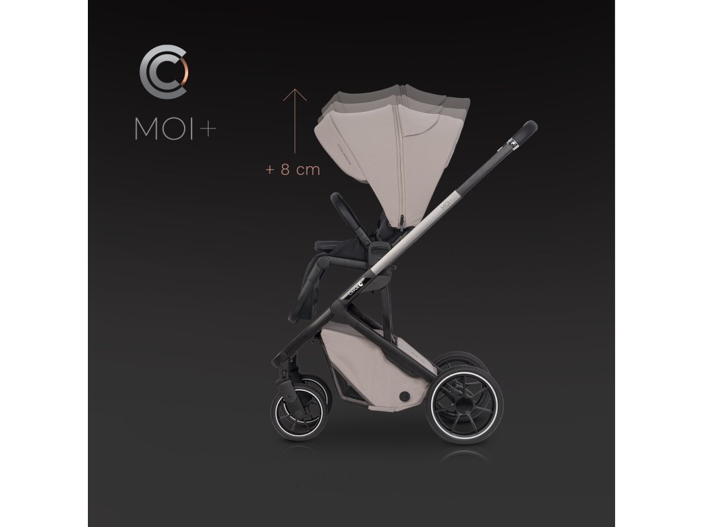Inovativní 3-stupňová regulace stříšky: Toto je skutečná revoluce ve světě kočárků. Unikátní systém umožňuje zvednout celou sluneční stříšku až o 8 cm výše. Co to znamená v praxi? Získáte dodatečný prostor, který může znamenat až o rok delší používání kočárku. Už žádné starosti s tím, že dítě rychle vyroste a hlavou se bude dotýkat stříšky. Moi+ doslova „roste“ spolu s vaším dítětem, čímž vám šetří peníze a starosti s hledáním nového modelu.
