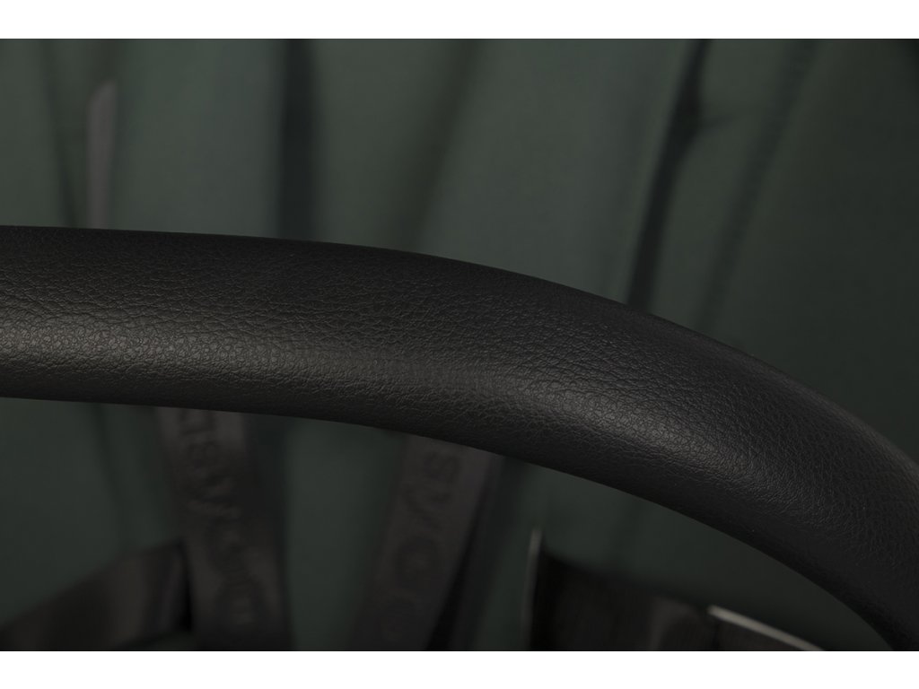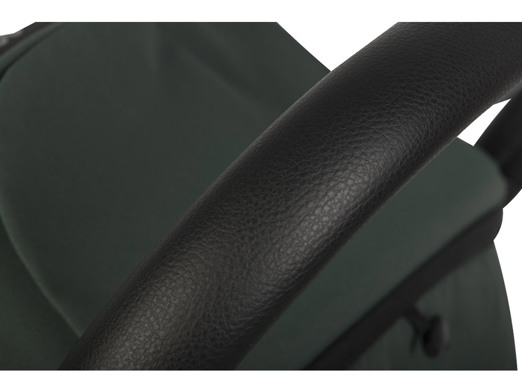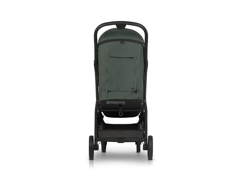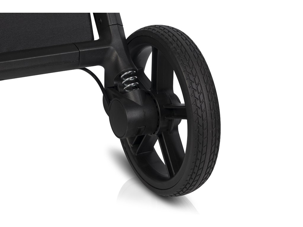 Odolný a stylový design: Rám kočárku je vyroben z hliníkových profilů pokrytých plastem, což zvyšuje odolnost proti poškrábání a korozi. Kočárek má moderní a sportovní vzhled díky matným černým kovovým prvkům a ekologické kůži.