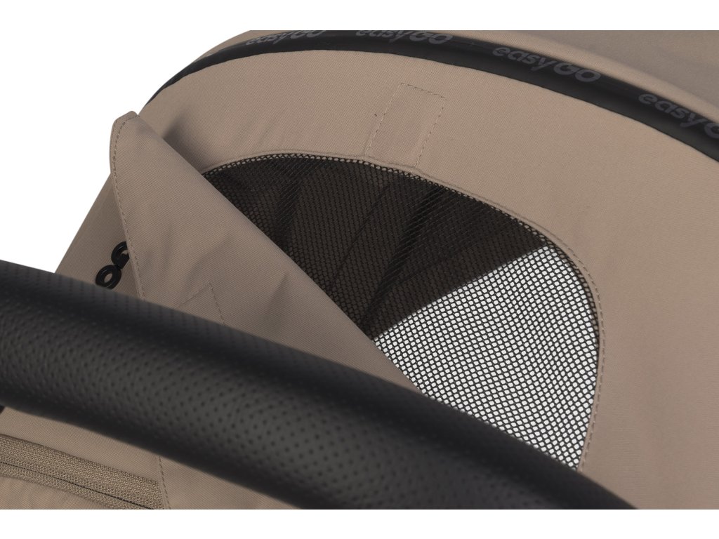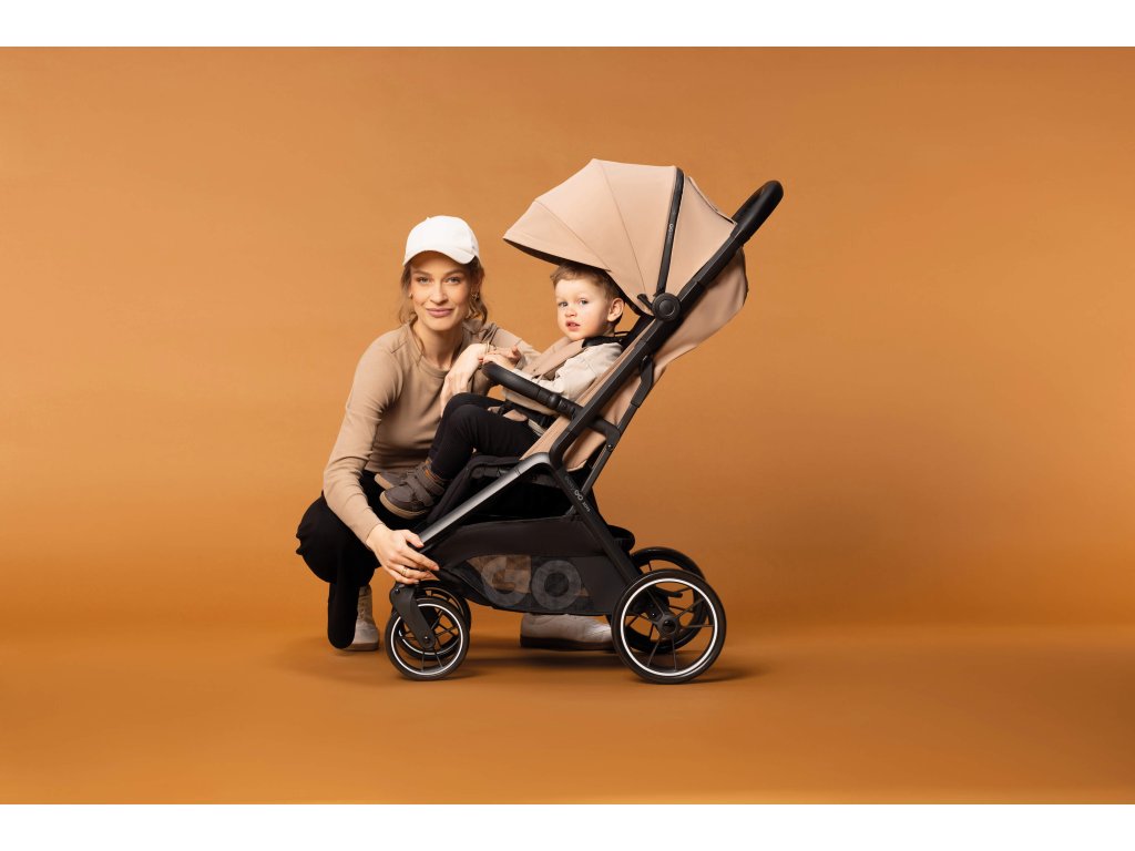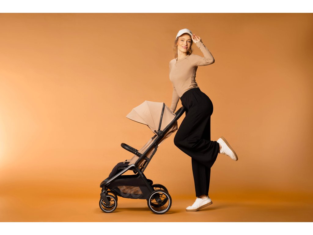 Stylový design: Kočárek je vyroben z kvalitních materiálů v módních barvách, s detaily jako perforovaná ekologická kůže na rukojeti a logovaný zip na stříšce. To dodává kočárku sportovní a moderní vzhled.