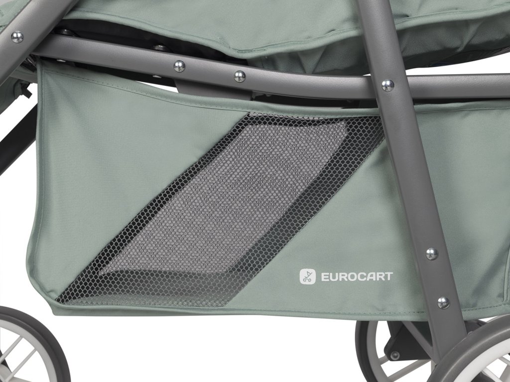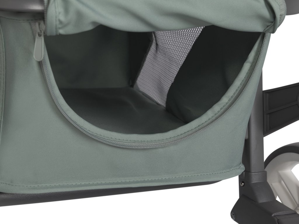 - Prostorný košík: Pod kočárkem se nachází velký nákupní košík s uzavíratelnou klapkou na zip, která usnadňuje přístup i při sklopeném opěradle.