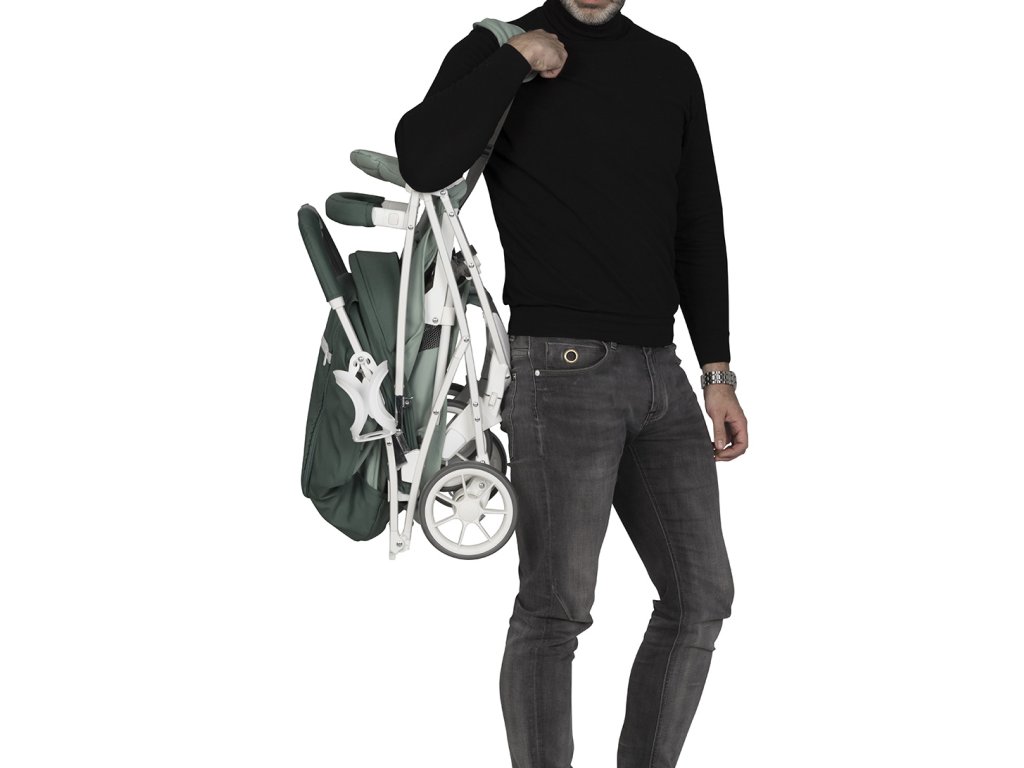- Bezpečnostní prvky: Spojená brzda, automatická blokace složeného kočárku pro snadné přenášení.