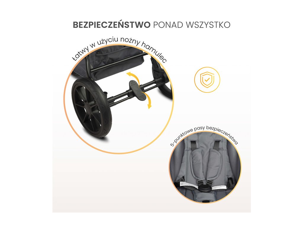 BEZPEČNOST PŘED VŠEMNastavitelné 5-bodové bezpečnostní pásy poskytují ochranu dítěte během jízdy. Nožní brzda umístěná mezi zadními koly zvyšuje úroveň bezpečnosti při zastavení. |