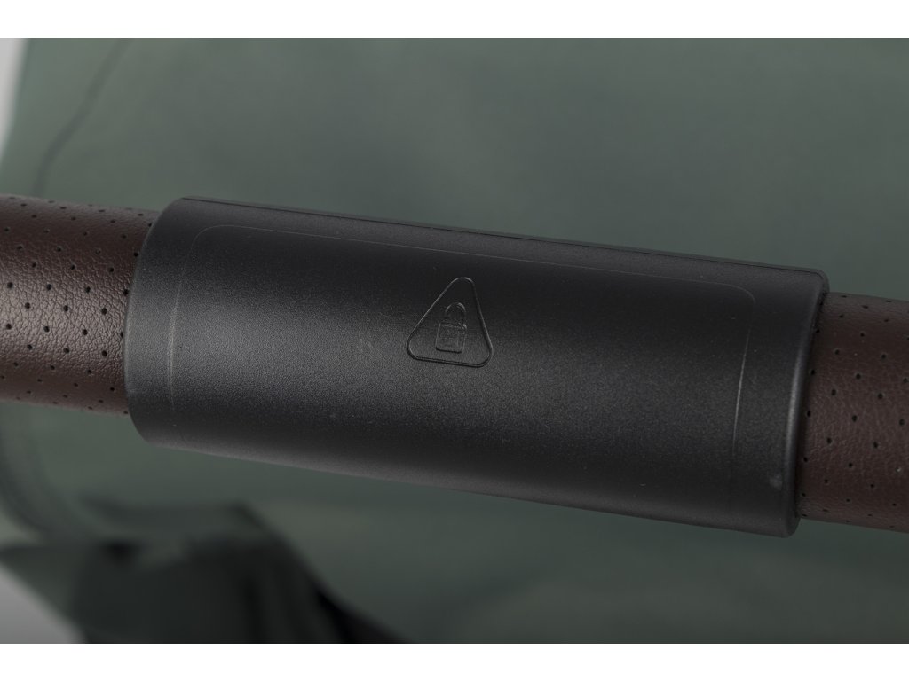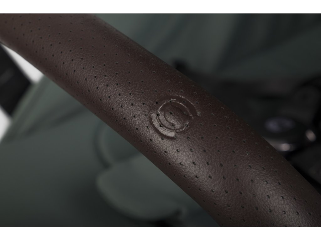 Rukojeť a bezpečnostní zábrana jsou potaženy nejkvalitnější ventilovanou ekologickou kůží v moderní tmavě hnědé barvě. Kůže je měkká a pohodlná, což výrazně zvyšuje komfort při vedení i přenášení kočárku. Kovové emblémy dokonale ladí s moderními barvami čalounění a anodizovaným rámem.