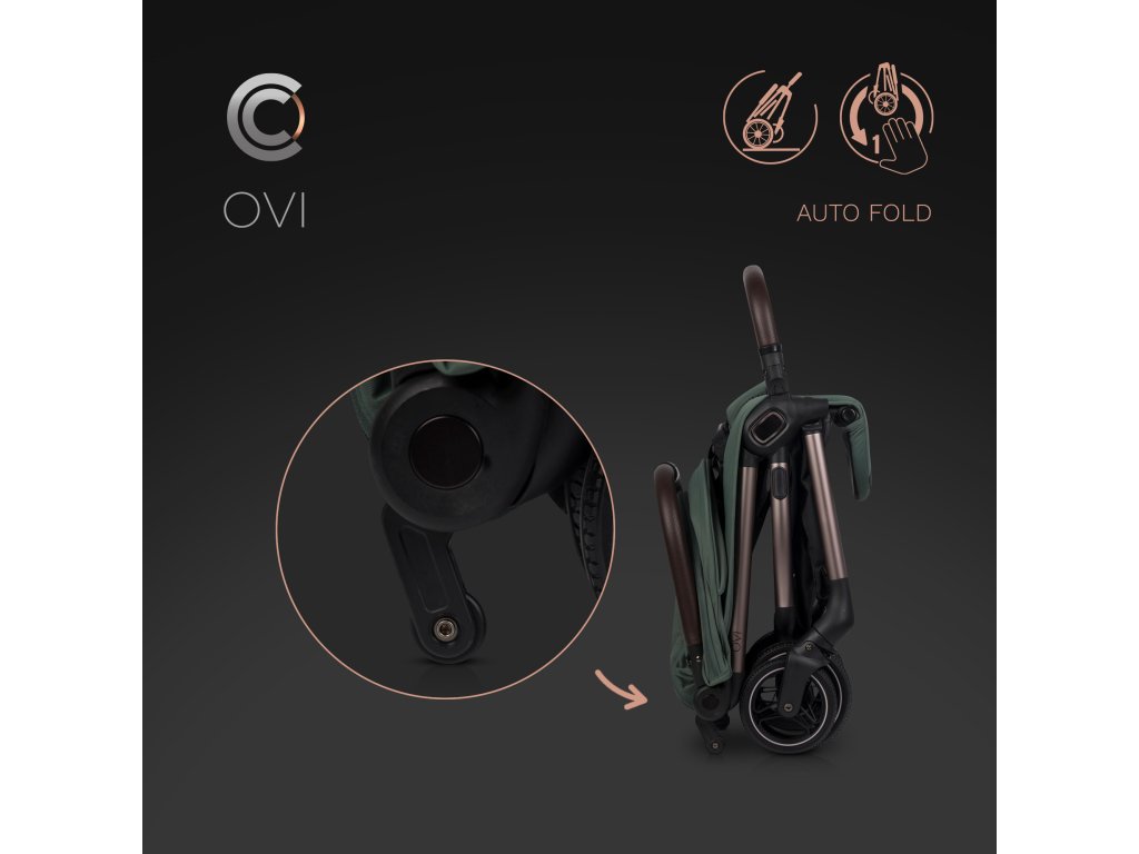 Největším vymožeností kočárku CAVOE OVI je jeho unikátní systém automatického skládání, který ovládáte jen jednou rukou. Stačí aktivovat mechanismus a zatlačit rukojeť dopředu – kočárek se automaticky složí jako wahadlo do velikosti malého kufříku. Po složení stojí kočárek vertikálně a bezpečnostní zábrana slouží jako praktická rukojeť pro přenášení.