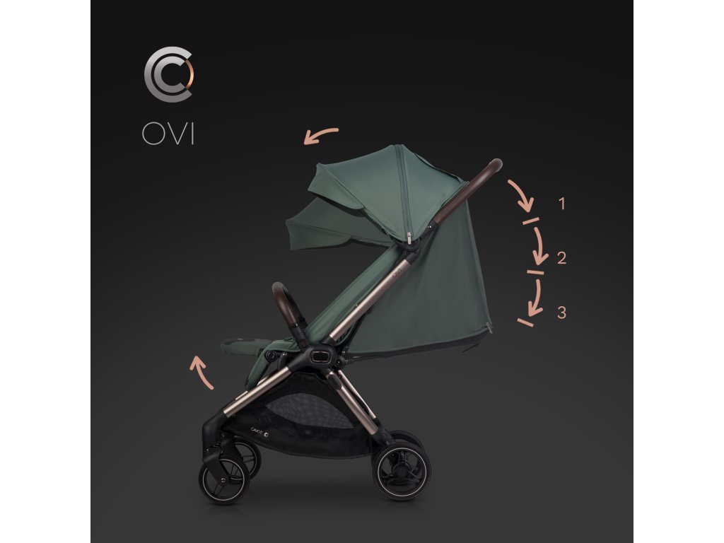 CAVOE OVI disponuje 3-stupňovou mechanickou regulací opěradla, která zahrnuje pozice: zcela ležící, pololežící a zcela sedící. Tato postupná regulace vyjímá OVI z konkurenčních kabinových kočárků, které obvykle mají méně pohodlnou regulaci pomocí pásu.
