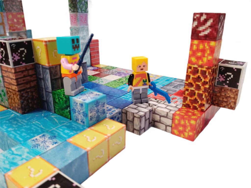 Každý blok je potištěn barevným motivem připomínajícím známé textury z herního prostředí – trávu, lávu, vodu, kovové rudy nebo dřevo. Díky tomu mohou děti nebo fanoušci Minecraftu tvořit vlastní světy, domy, hrady nebo bojové arény.