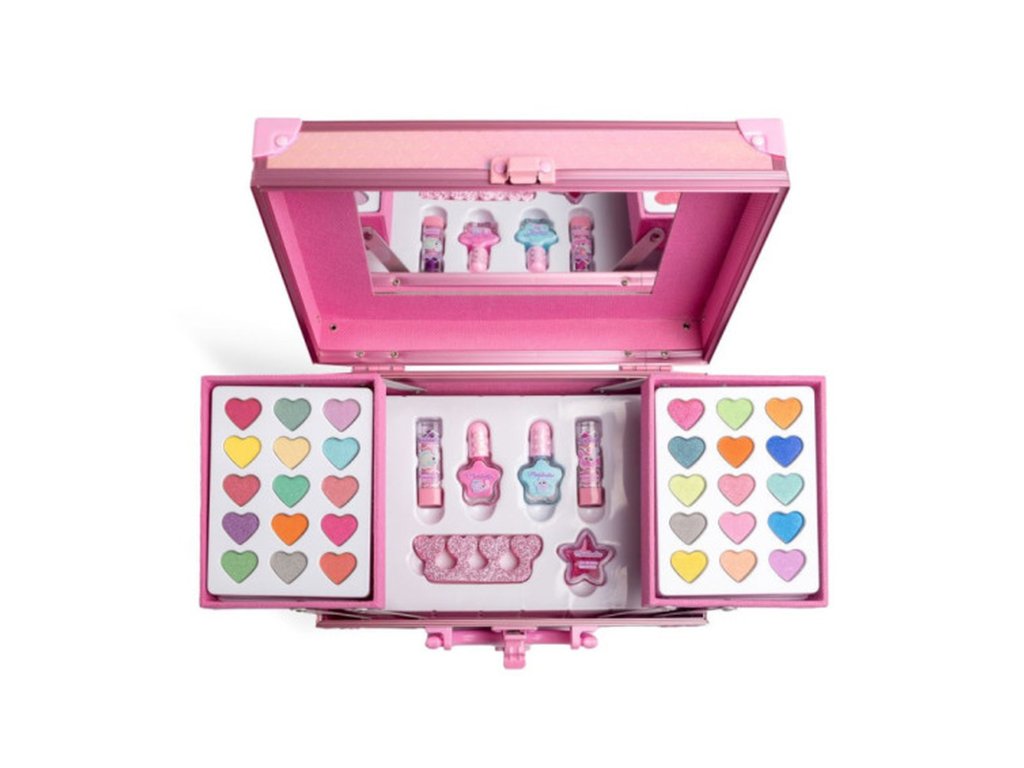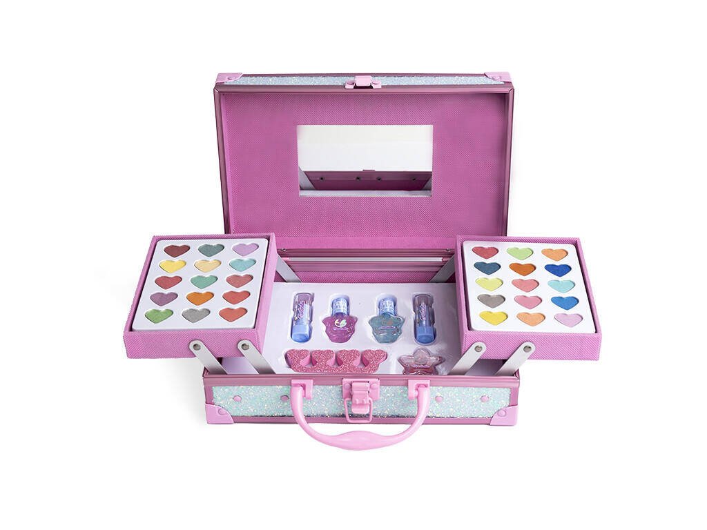 Uvnitř kufříku se nachází bohatá sada kosmetiky – dvě paletky očních stínů ve tvaru srdíček, lesky na rty, dětské laky na nehty a pěnové aplikátory. Vše je uloženo přehledně a bezpečně ve výsuvných přihrádkách, které podporují samostatnost a organizovanost při hře. Integrované zrcátko usnadňuje nanášení make-upu a podporuje kreativní vyjadřování.