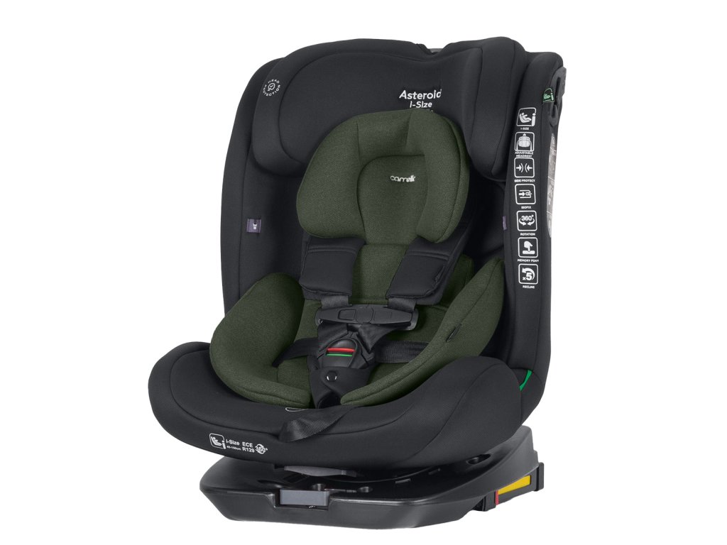 Autosedačka Asteroid i-Size Univerzální dětská autosedačka splňuje moderní standard I-Size. Je vybavena boční ochranou proti nárazu, upevňovacím systémem Isofix, Top Tether (kotvicím pásem) a rotací o 360°. Přídavný zámek bezpečnostního pásu. Příklad instalace sedačky pro přepravu dětí do 15 měsíců, s výškou od 40 do 105 cm (do 18 kg), v souladu s certifikační normou v evropských zemích – I-SIZE R129/03. Maximální úhel sklonu: 145°. Popruh Top Tether zajišťuje bezpečné upevnění sedačky. Sada obsahuje anatomickou vložku (pro skupinu 0+). Slouží k zajištění horizontálnější polohy dítěte v autosedačce. Rotace o 360° umožňuje snadnou změnu směru sezení a pohodlné nastupování malého spolujezdce. Úhel sklonu v poloze „po směru jízdy“: 102°–114°. 3 polohy sklonu. Vhodná pro přepravu dětí od 15 měsíců (výška od 76 cm). Nastavitelná opěrka hlavy je vyrobena z paměťové pěny a nabízí 10 poloh, což umožňuje přizpůsobit autosedačku růstu dítěte. Do výšky 105 cm (přibližně 18 kg) se používají bezpečnostní pásy autosedačky, poté se používají běžné bezpečnostní pásy vozidla. Bezpečnost dítěte je zajištěna bezpečnostním pásem a 5bodovým zámkem s vysokou pevností. Tlačítko zámku má zelený indikátor uzavření a zřetelný cvaknutí, které zabraňuje nesprávnému použití. Pásy jsou určeny pro děti do 18 kg.Doplňkové parametry