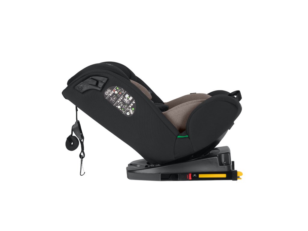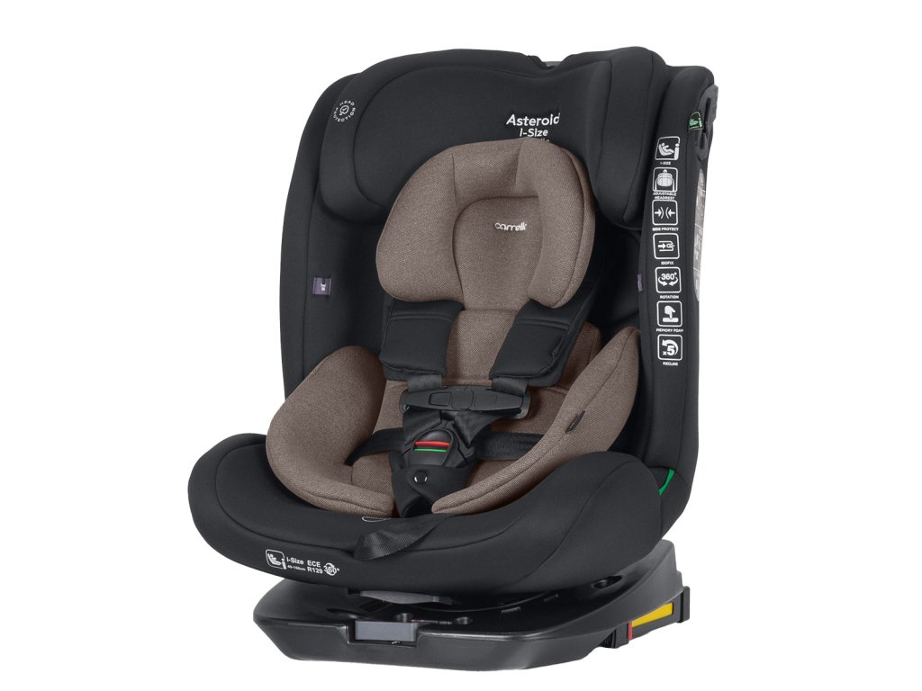 Autosedačka Asteroid i-Size Univerzální dětská autosedačka splňuje moderní standard I-Size. Je vybavena boční ochranou proti nárazu, upevňovacím systémem Isofix, Top Tether (kotvicím pásem) a rotací o 360°. Přídavný zámek bezpečnostního pásu. Příklad instalace sedačky pro přepravu dětí do 15 měsíců, s výškou od 40 do 105 cm (do 18 kg), v souladu s certifikační normou v evropských zemích – I-SIZE R129/03. Maximální úhel sklonu: 145°. Popruh Top Tether zajišťuje bezpečné upevnění sedačky. Sada obsahuje anatomickou vložku (pro skupinu 0+). Slouží k zajištění horizontálnější polohy dítěte v autosedačce. Rotace o 360° umožňuje snadnou změnu směru sezení a pohodlné nastupování malého spolujezdce. Úhel sklonu v poloze „po směru jízdy“: 102°–114°. 3 polohy sklonu. Vhodná pro přepravu dětí od 15 měsíců (výška od 76 cm). Nastavitelná opěrka hlavy je vyrobena z paměťové pěny a nabízí 10 poloh, což umožňuje přizpůsobit autosedačku růstu dítěte. Do výšky 105 cm (přibližně 18 kg) se používají bezpečnostní pásy autosedačky, poté se používají běžné bezpečnostní pásy vozidla. Bezpečnost dítěte je zajištěna bezpečnostním pásem a 5bodovým zámkem s vysokou pevností. Tlačítko zámku má zelený indikátor uzavření a zřetelný cvaknutí, které zabraňuje nesprávnému použití. Pásy jsou určeny pro děti do 18 kg.Doplňkové parametry
