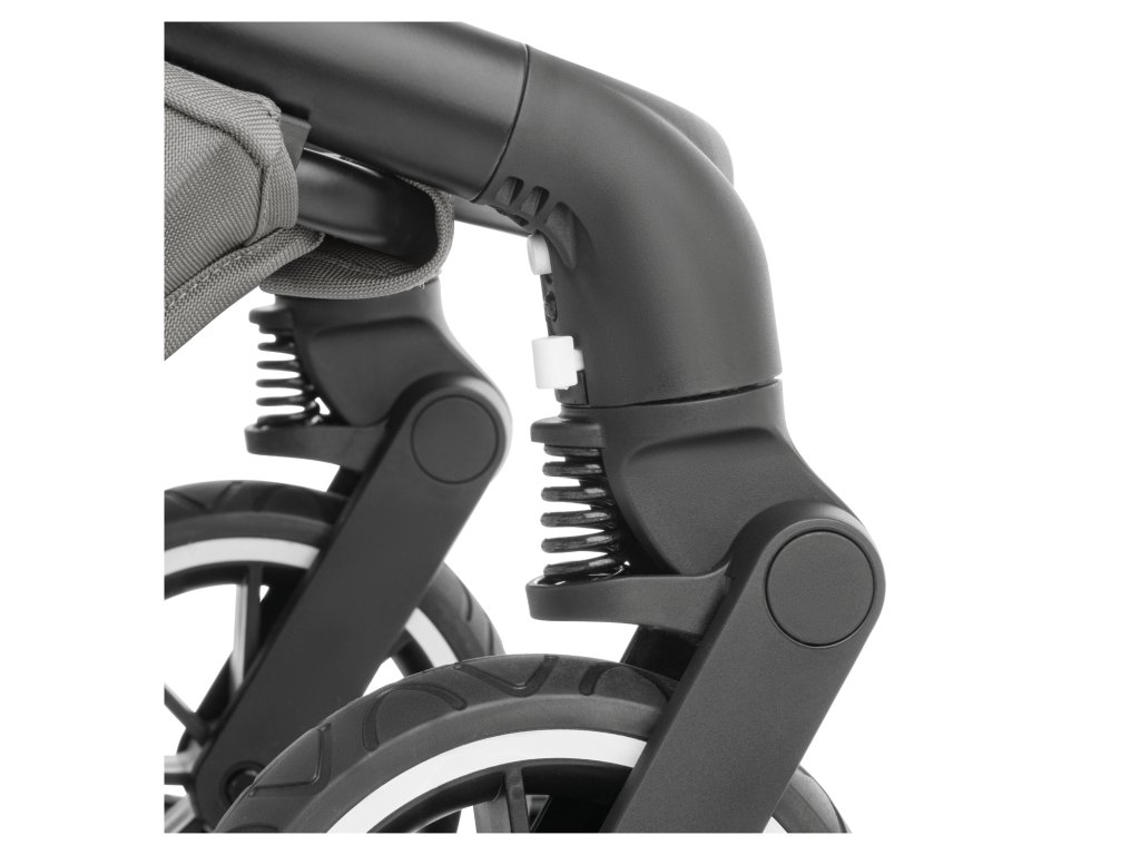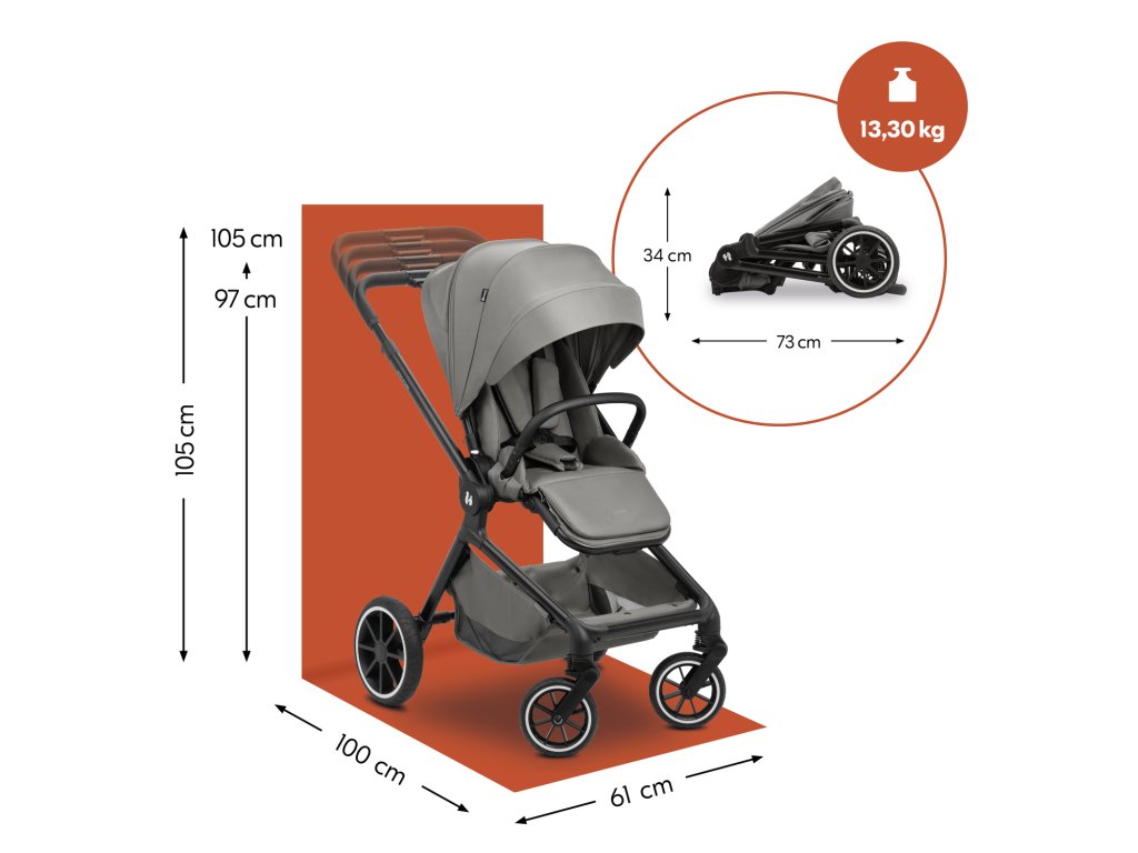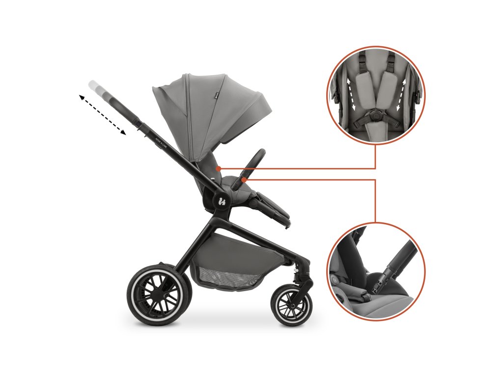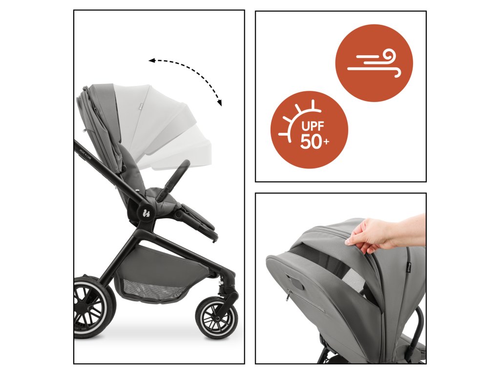 Díky gumovým kolům do každého terénu jste vybaveni na všechny cesty. Odpružení 4 x 4 jemně pohupuje vaše děťátko, zatímco prodlužovací XL sluneční stříška (UV 50+) jej chrání za každého počasí a síťovaná okénka poskytují dostatek čerstvého vzduchu. Sedátko kočárku má výškově nastavitelné 5-bodové bezpečnostní pásy a dobře polstrovanou, extra vysokou opěrku zad. Opěrka nohou roste s vaším dítětem.