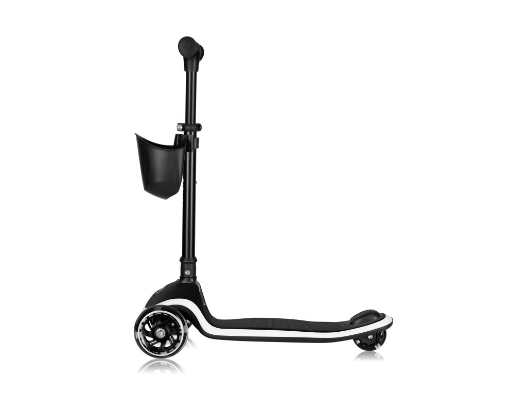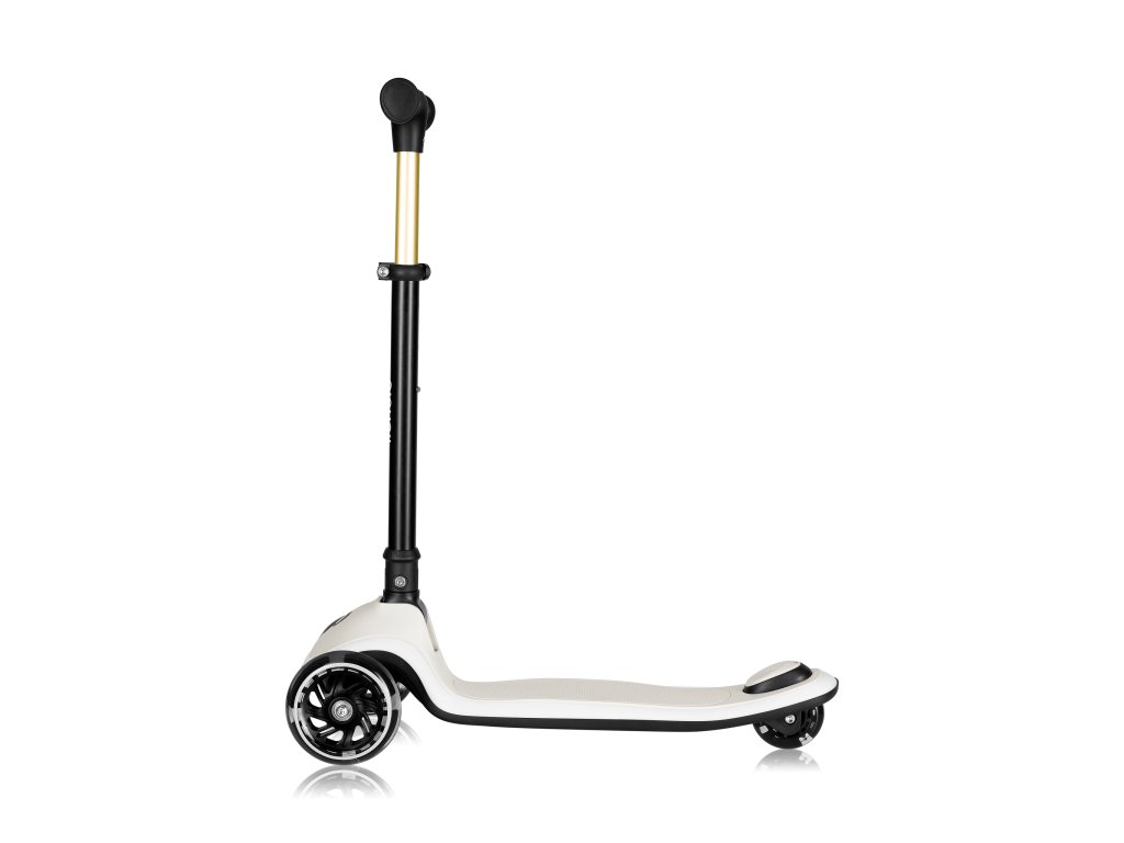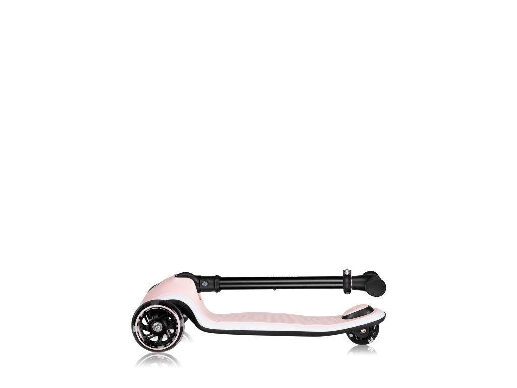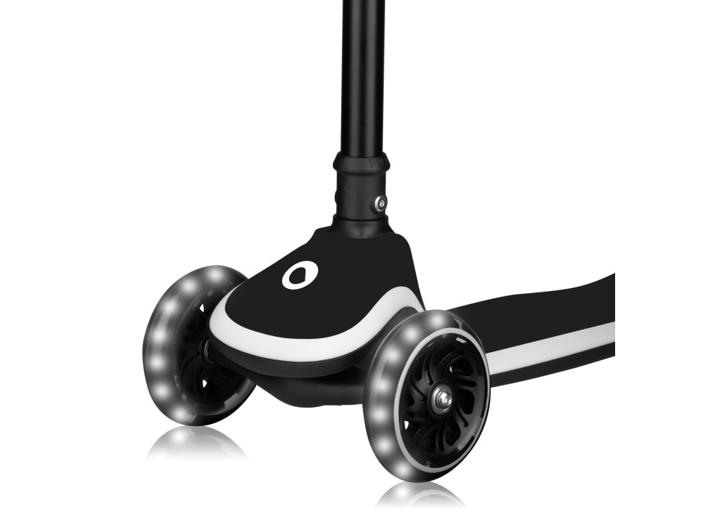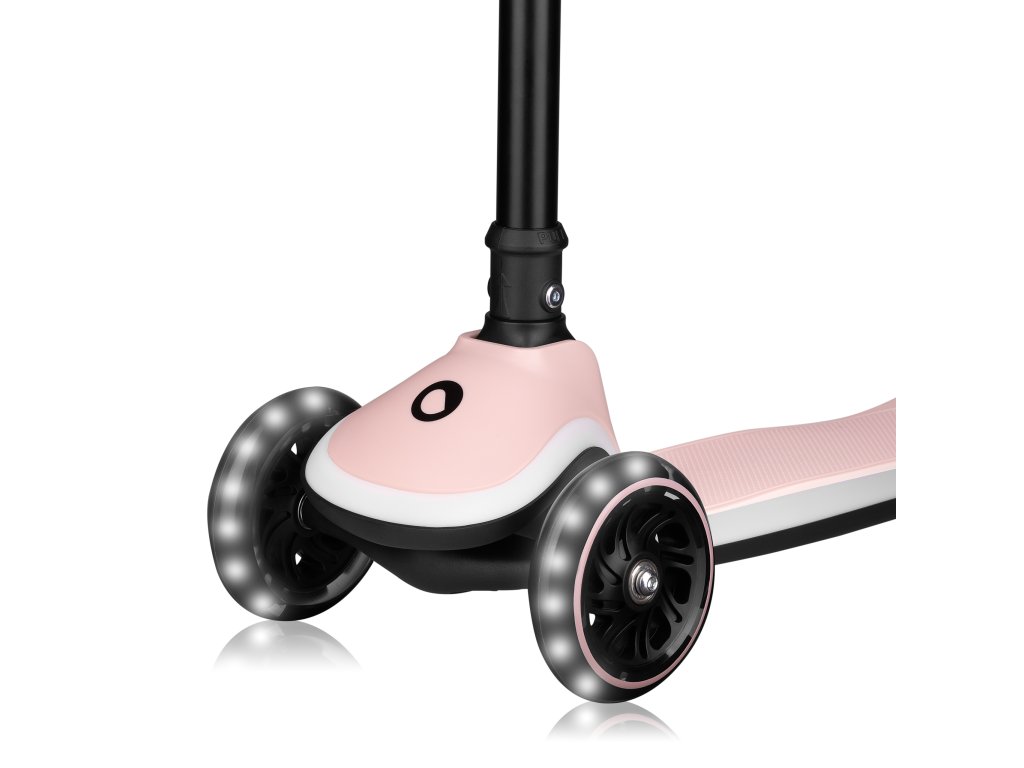 Přední kolečka svítí bíle, což vypadá skvěle a zároveň je dítě vždy viditelné – vždy, protože osvětlení je napájeno a aktivováno pohybem a ke své činnosti nepotřebuje baterie!