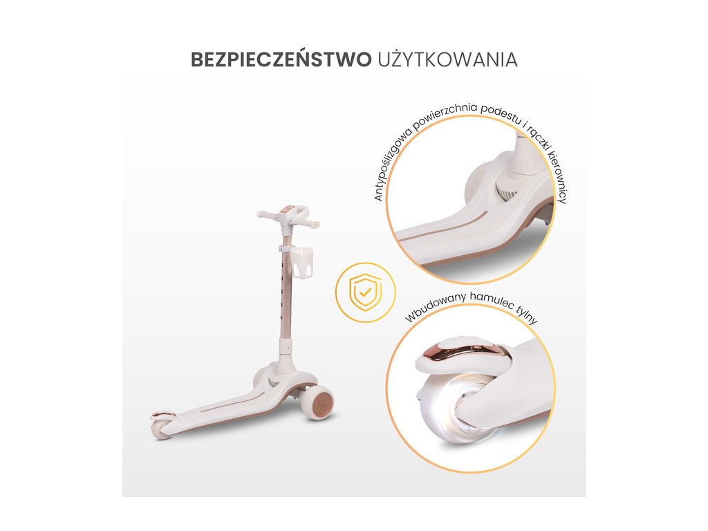 Lehká konstrukce (přibližně 2,6 kg) umožňuje dětem snadné manévrování a samostatné přenášení koloběžky. Systém rychlého skládání dovoluje složit koloběžku jediným pohybem, což je ideální pro: