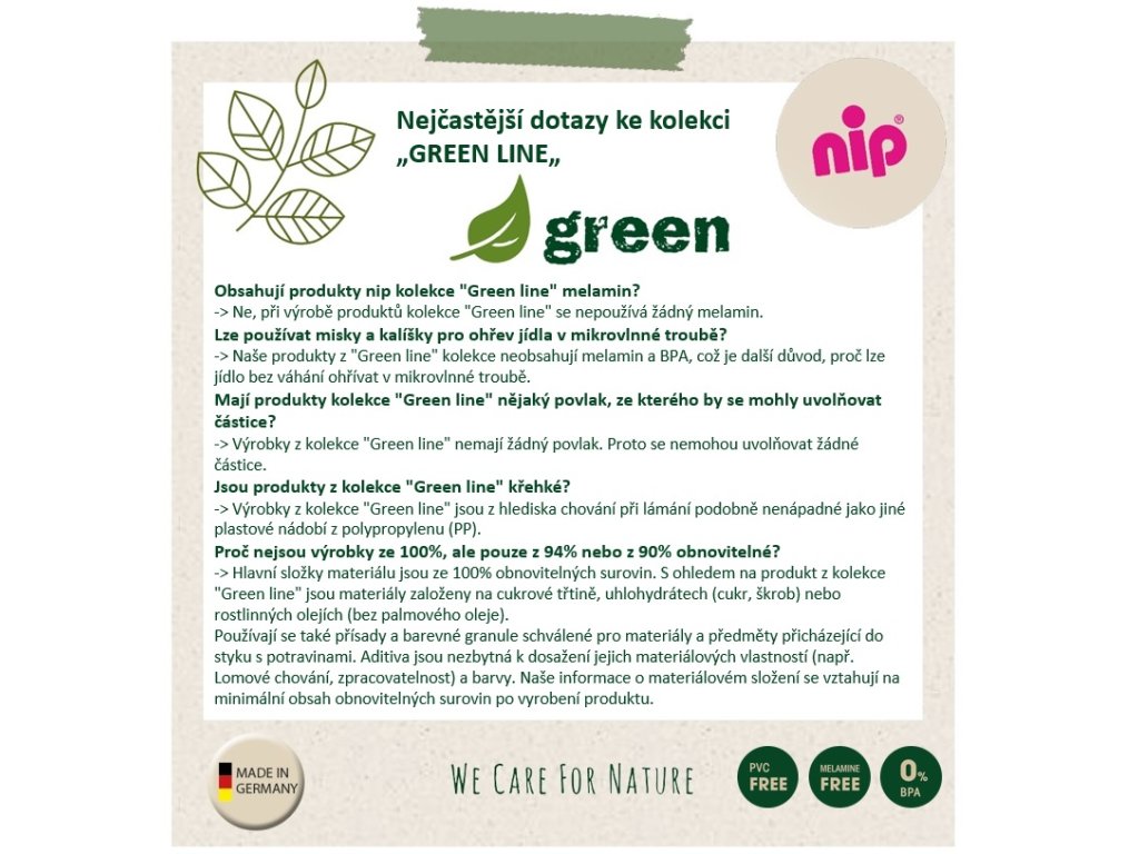 Z pocitu odpovědnosti vůči budoucím generacím se zavazujeme zacházet s přírodou a jejími zdroji šetrně. Jsme přesvědčeni, že udržitelné výrobky pro děti mohou být praktické i krásné. Proto je vyrábíme v co největší míře z přírodních nebo obnovitelných surovin. Použité materiály jsou vědomě přizpůsobeny různým vlastnostem produktů. Série NATURE line od značky nip® se skládá z kombinace biokruhových a fosilních složek.