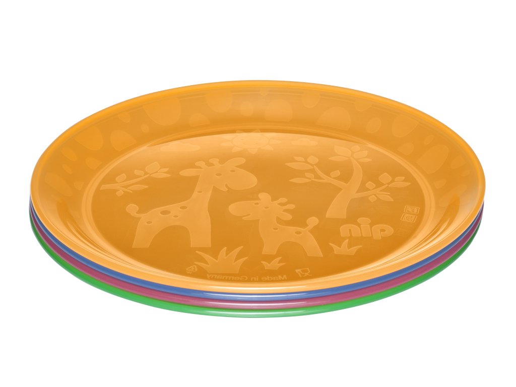 Sada 4 talířků s roztomilým motivem žirafy. Lehký materiál a zaoblené hrany jsou ideální pro malé strávníky, krásné talířky podporují v samostatném papání.