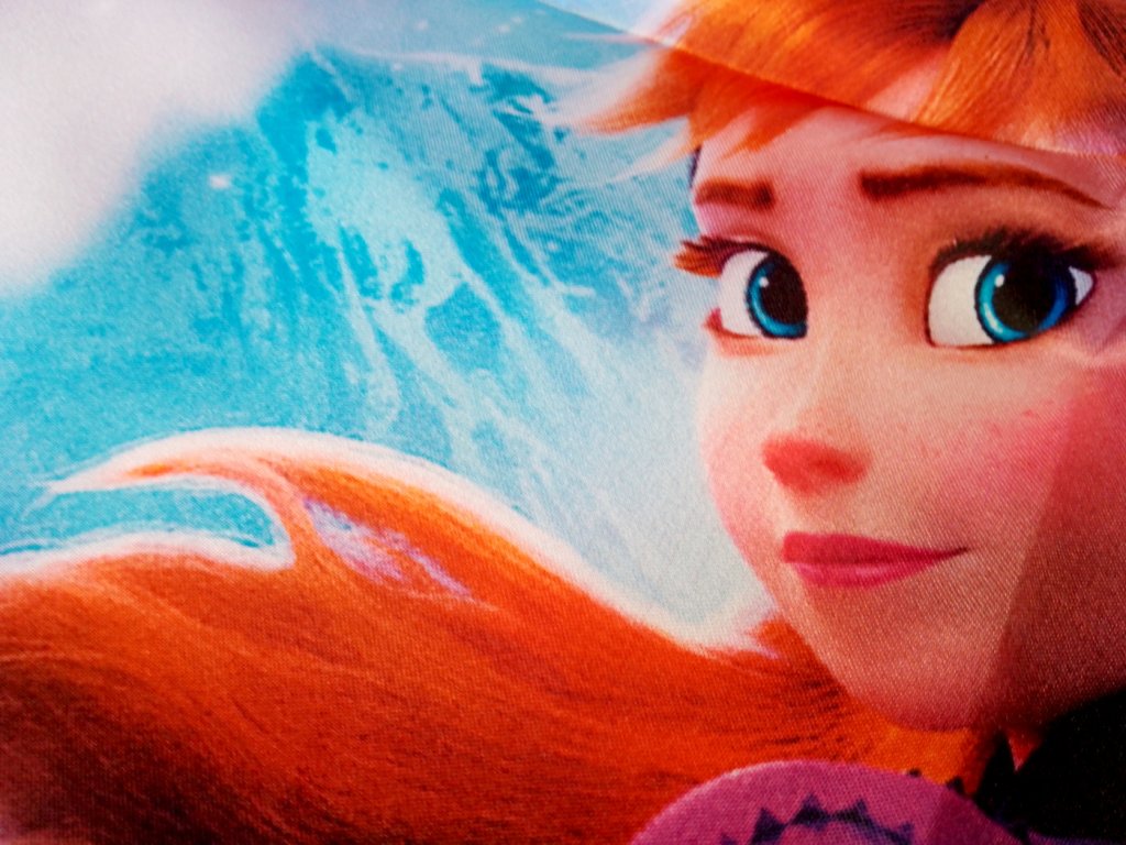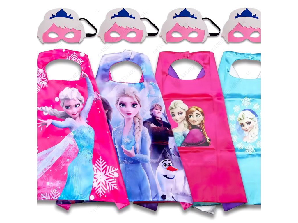 Plášť zdobí detailní potisk s oblíbenými postavami – Elsou, Annou, Kristoffem a veselým sněhulákem Olafem, takže se dítě může snadno přenést do pohádkového světa Arendelle. Součástí sady je také maska s motivem Elsy, která dotváří kouzelný vzhled.