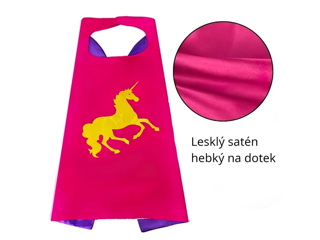 Plášť v sytě růžové barvě zdobí velký zlatý jednorožec, který působí elegantně a hravě zároveň. Součástí balení je také maska ve stejné barevné kombinaci, díky níž se dítě snadno převtělí do tajemné pohádkové bytosti.
