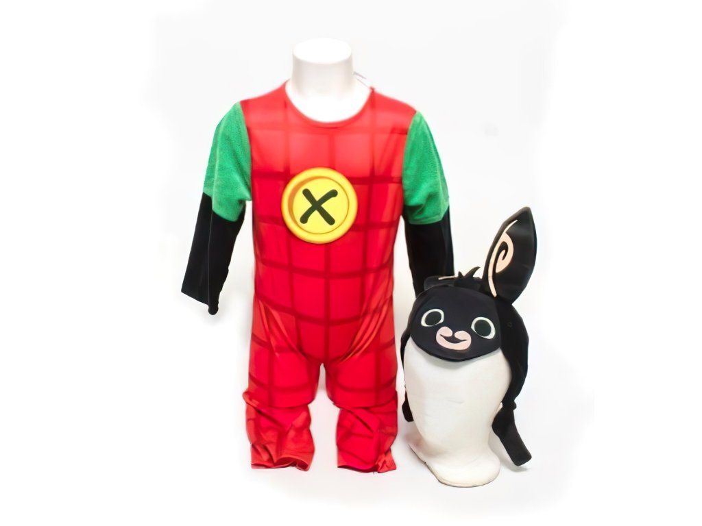 Součástí kostýmu je vyztužená čepice s ušima a potiskem obličeje Binga, která se zapíná na suchý zip pod bradou a pohodlný elastický overal, který má v zadní části zapínání na suchý zip. Látka celého overalu je potištěna výraznými barvami, které jsou typické pro králíčka Binga.