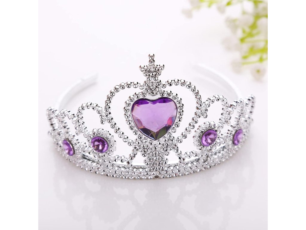 Elegantní korunka a ladící žezlo jsou zdobeny fialovými kamínky ve tvaru srdce, které dodávají celému vzhledu jemný královský nádech. Korunka je lehká a pohodlná na nošení, vyrobená z plastového materiálu s jemnými detaily, které připomínají kouzelnou atmosféru království. Díky pružnému provedení dobře drží na hlavě a je ideální pro dětské hraní i slavnostní chvíle.