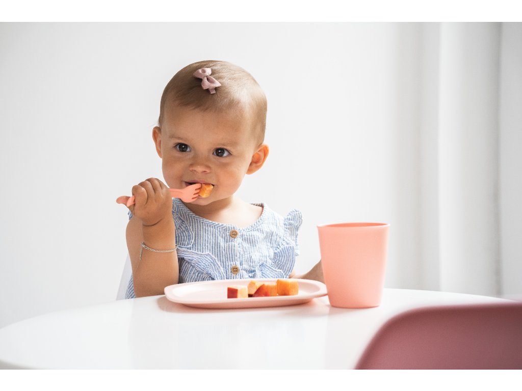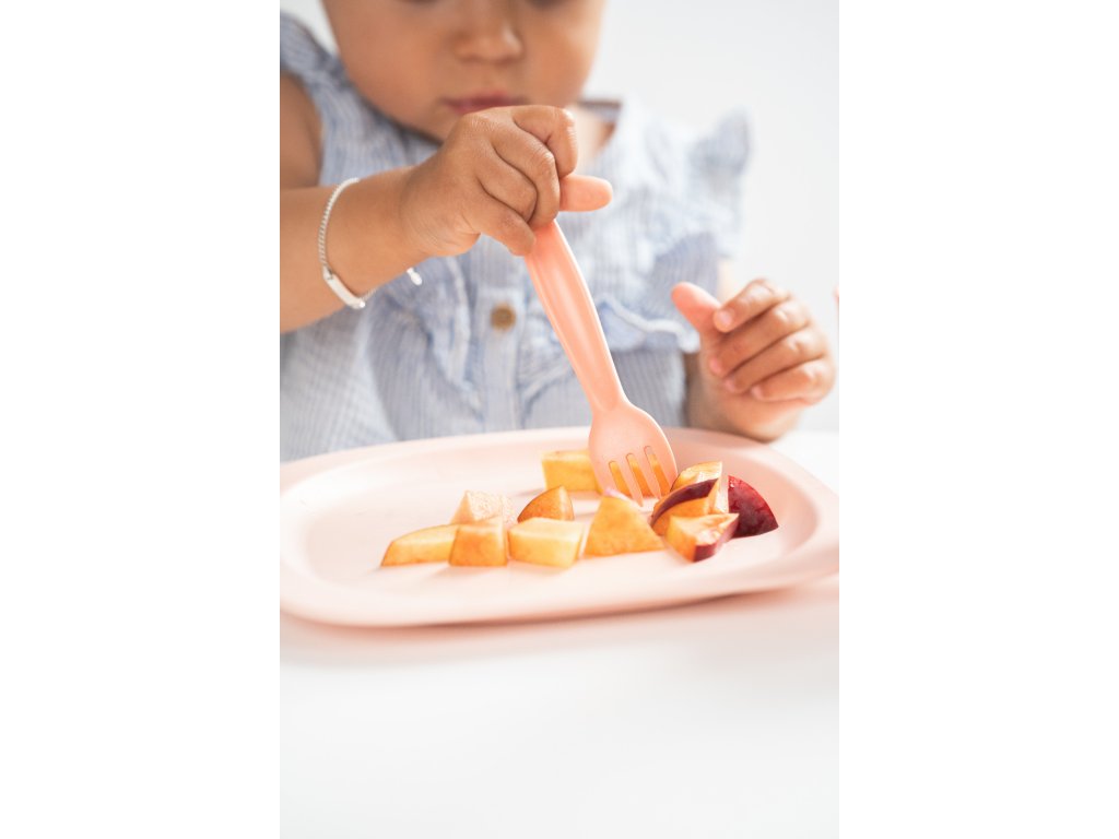 Sada se skládá ze lžičky a vidličky, je ideální pro děti od přibližně 9 měsíců. Lžička má extra plochý tvar, ideální pro vkládání do malých dětských úst, dítě snadno lžičku vyprázdní až do poslední kapičky. Příbor je dostupný v krásných přírodních barvách.