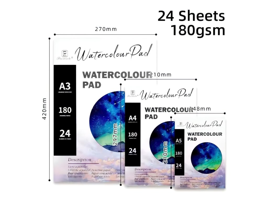 Každý list o gramáži 180 g/m² je speciálně navržen pro optimální absorpci akvarelových barev, aniž by se kroutil nebo propíjel. Blok obsahuje 24 pevných listů formátu A3 a je vybaven robustní podložkou, která zajišťuje stabilní povrch pro malování kdekoli.