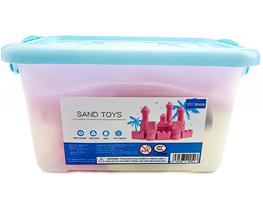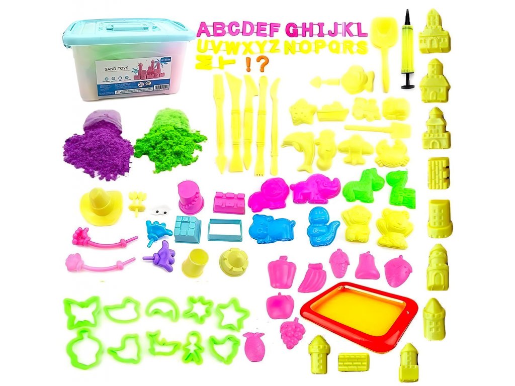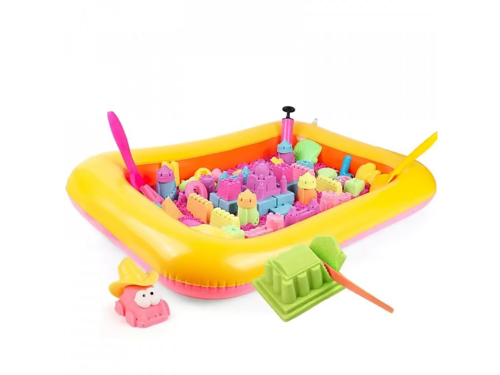Sada je doplněna 100 různými formami, které představují zvířata, písmena abecedy, ovoce, figurky, vozidla a mnoho dalšího. Společně s nafukovacím pískovištěm, lopatkou, kufru a dalšími nástroji vytváří kompletní sadu, která přináší maximální zábavu a kreativitu.